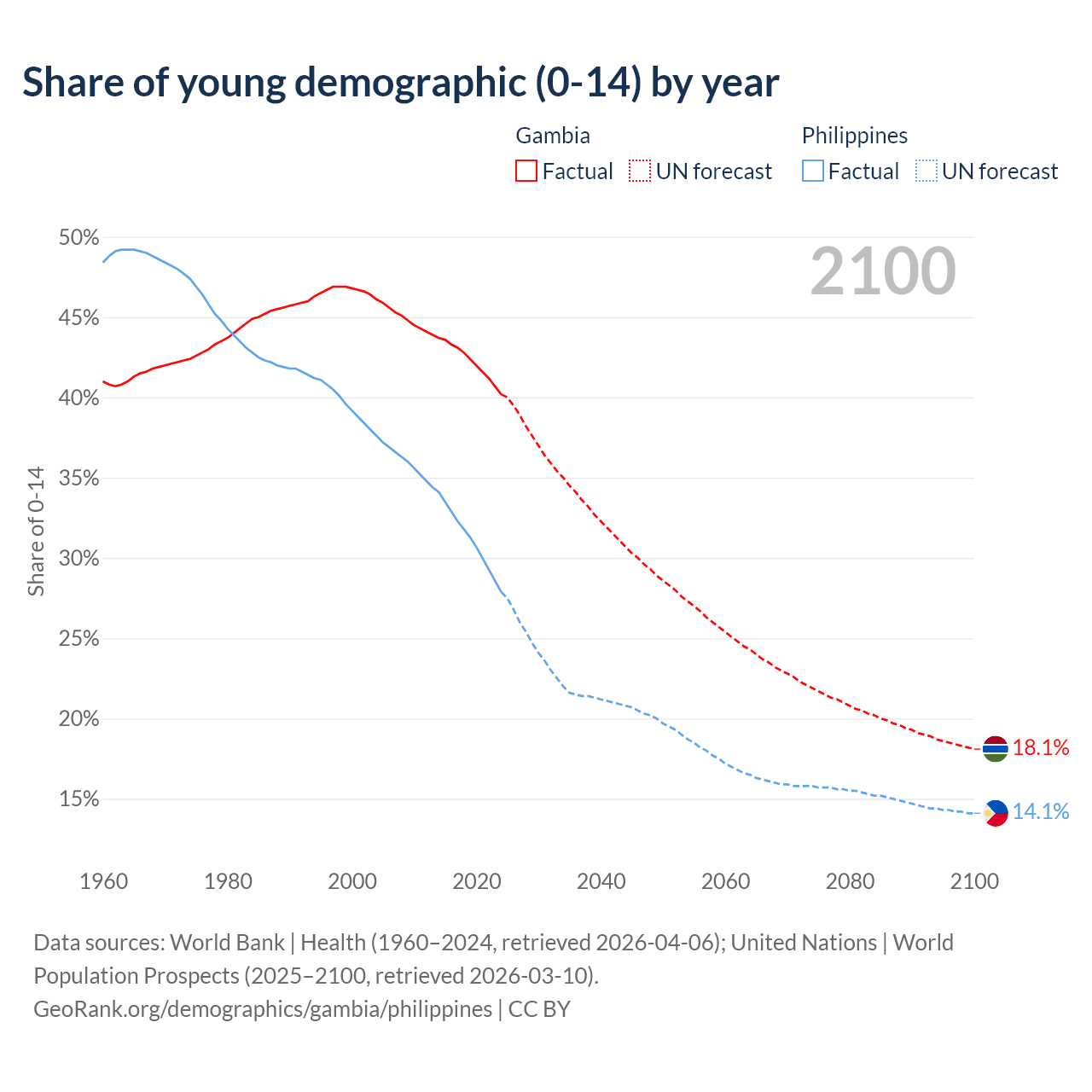 - The share of young demographic (0-15 years old) in the Gambia is 40.2% vs 27.9% in the Philippines.
