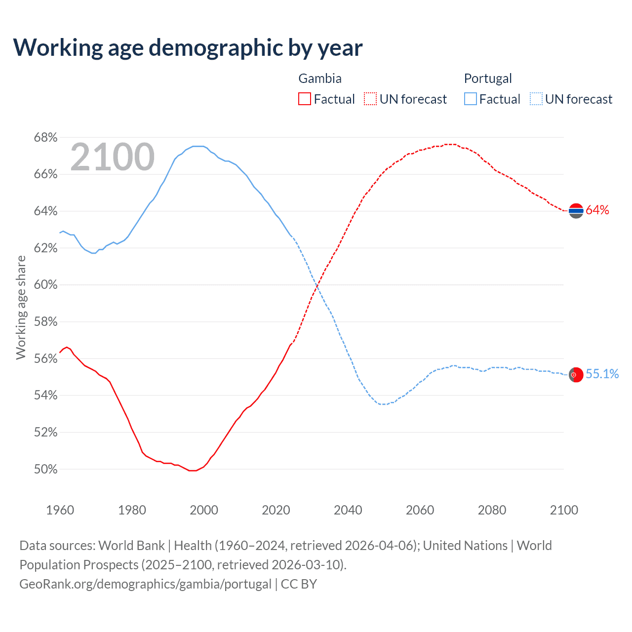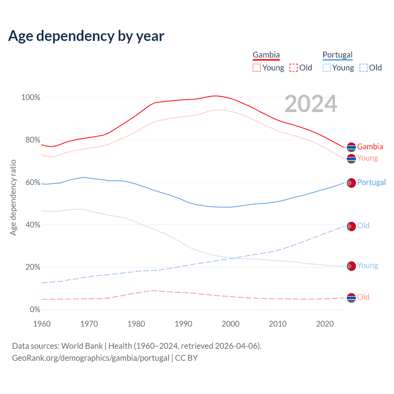 The share of older people aged 65 and over is 3.08% in the Gambia and 24.5% in Portugal. Life expectancy in the Gambia compared to Portugal .