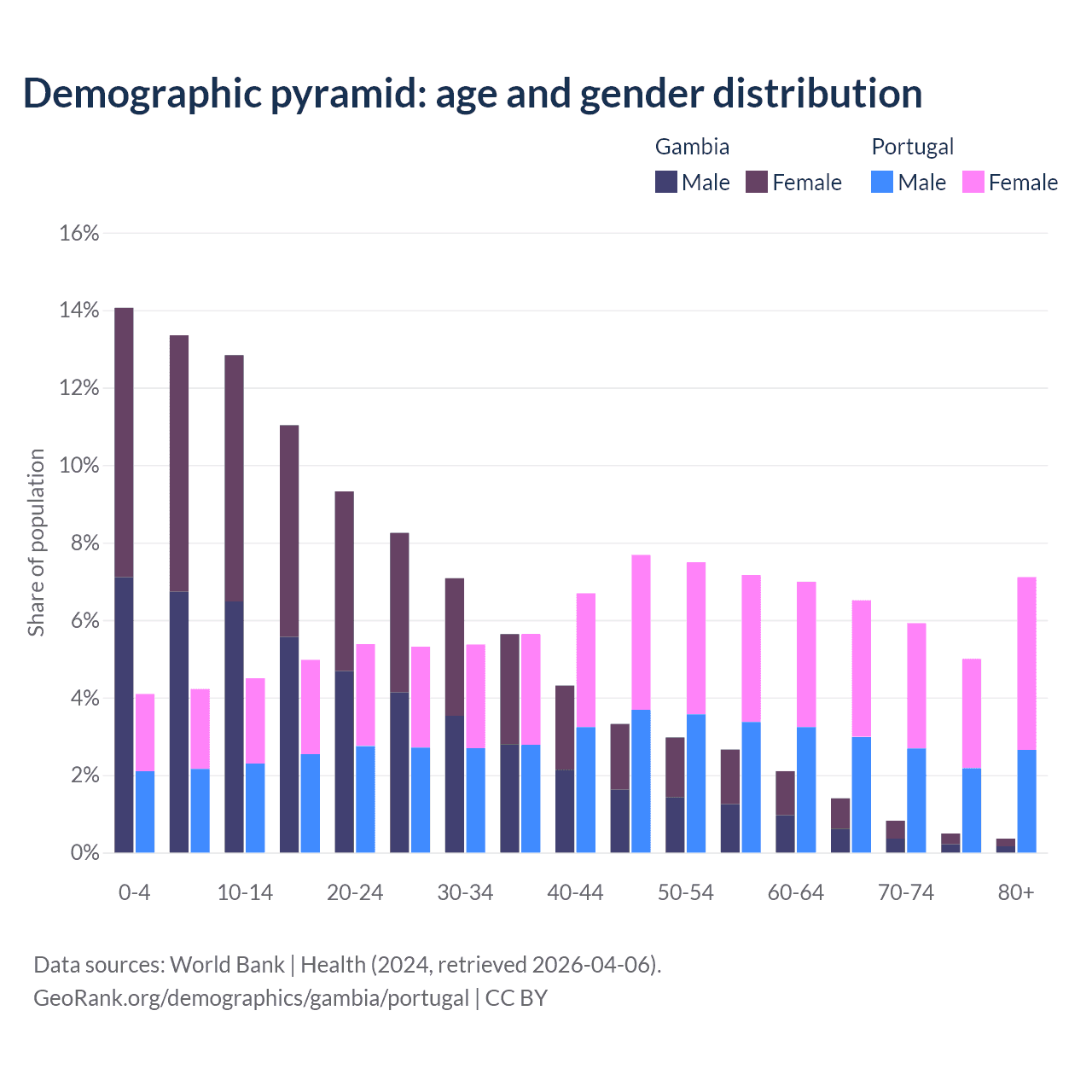 - The share of young demographic (0-15 years old) in the Gambia is 40.2% vs 12.8% in Portugal.