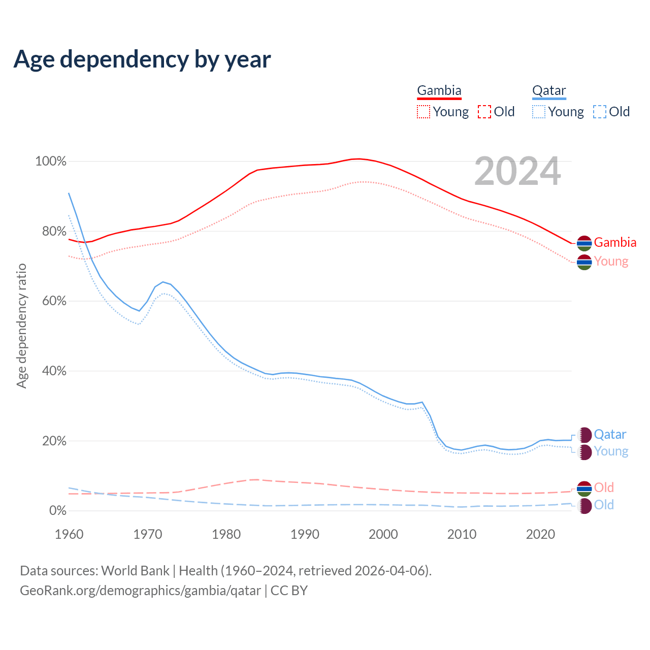- The Gambia is ranked 171/196 by median age (oldest to youngest) vs 78/196 for Qatar.