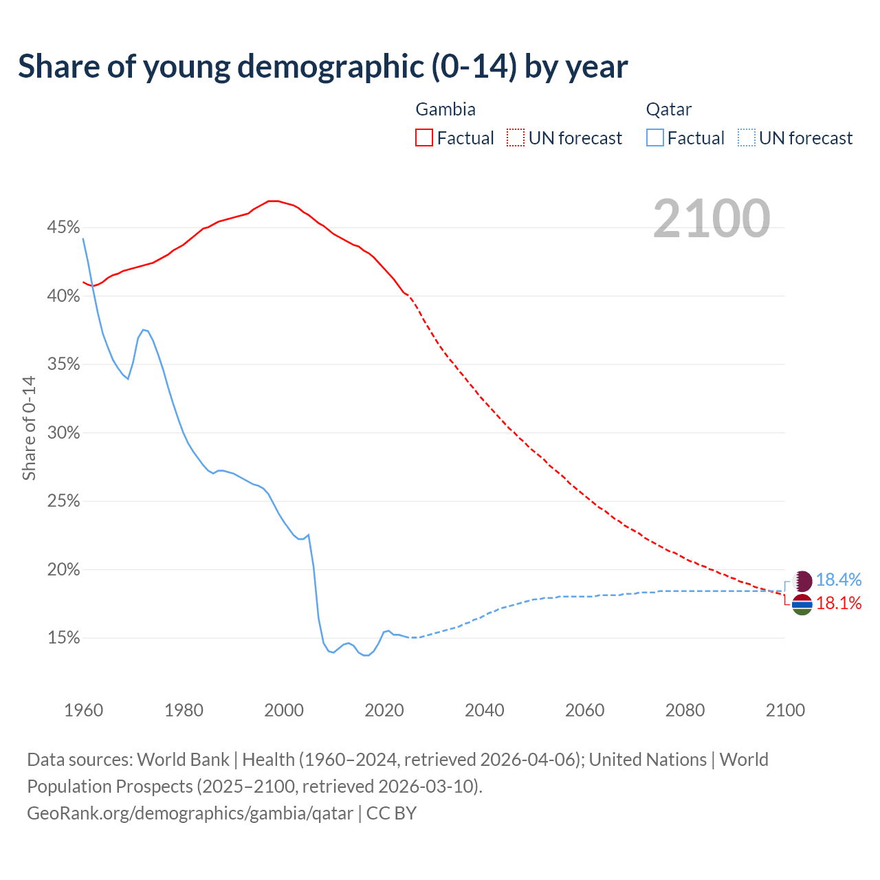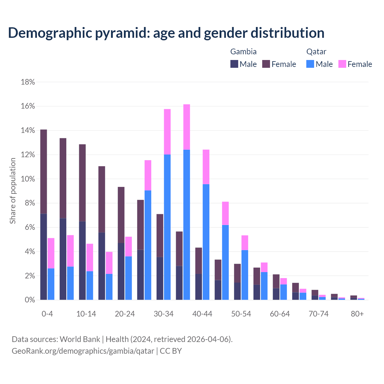 - The share of young demographic (0-15 years old) in the Gambia is 40.2% vs 15.1% in Qatar.