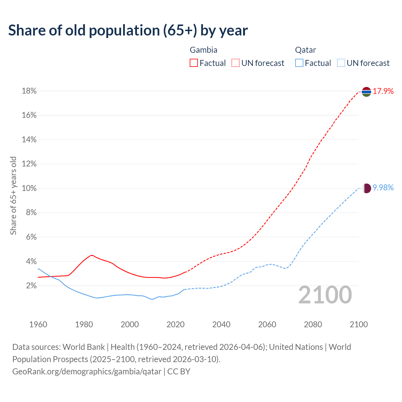 The share of older people aged 65 and over is 3.08% in the Gambia and 1.68% in Qatar. Life expectancy in the Gambia compared to Qatar .