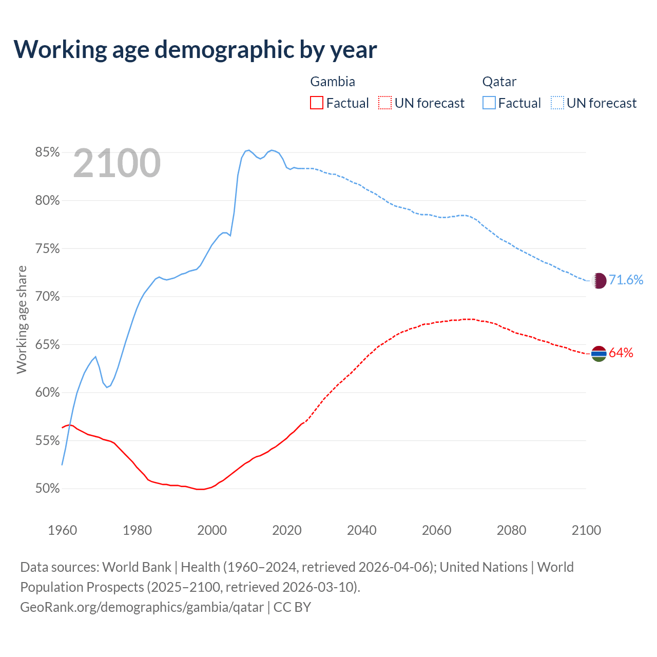 Median age Gambia vs Qatar, 1960-2100