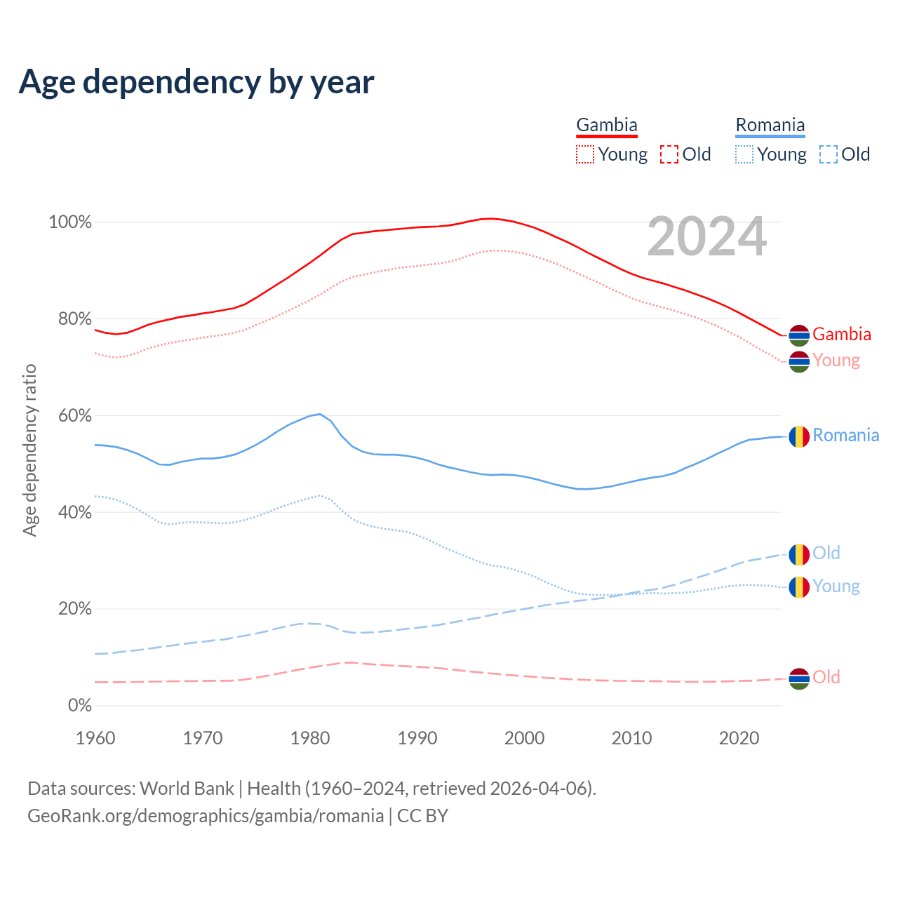 - The Gambia is ranked 171/196 by median age (oldest to youngest) vs 23/196 for Romania.