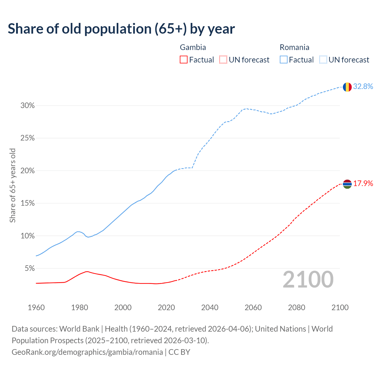 The share of older people aged 65 and over is 3.08% in the Gambia and 20% in Romania. Life expectancy in the Gambia compared to Romania .
