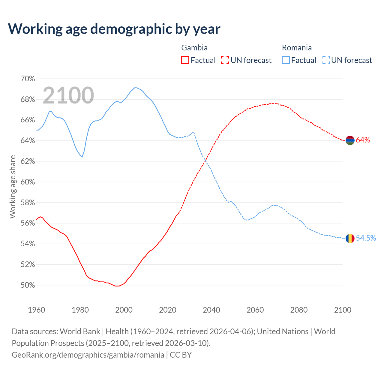 - The Gambia has 1.64M working age adults (aged 15-64) vs 12.1M in Romania.