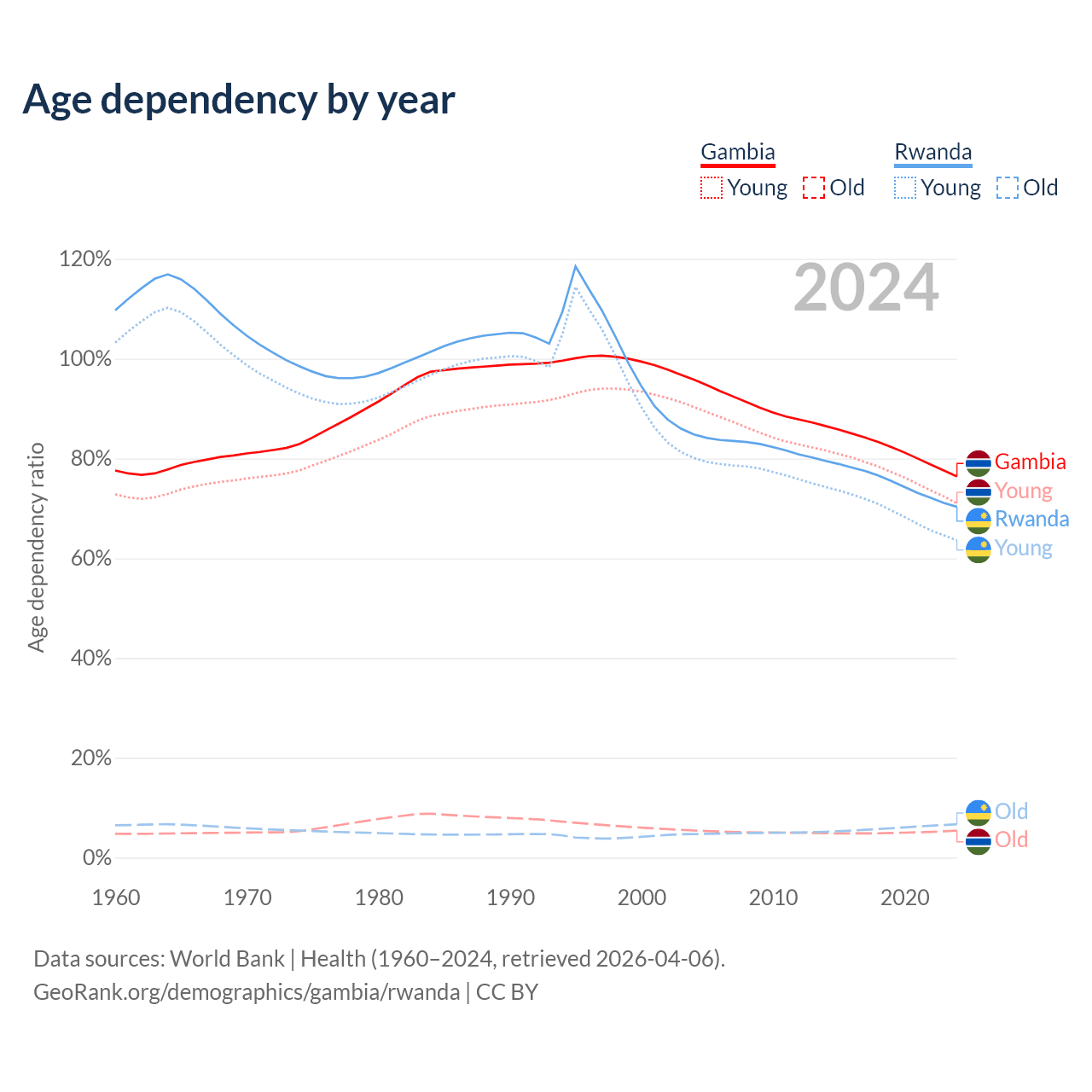 - The Gambia is ranked 171/196 by median age (oldest to youngest) vs 160/196 for Rwanda.
