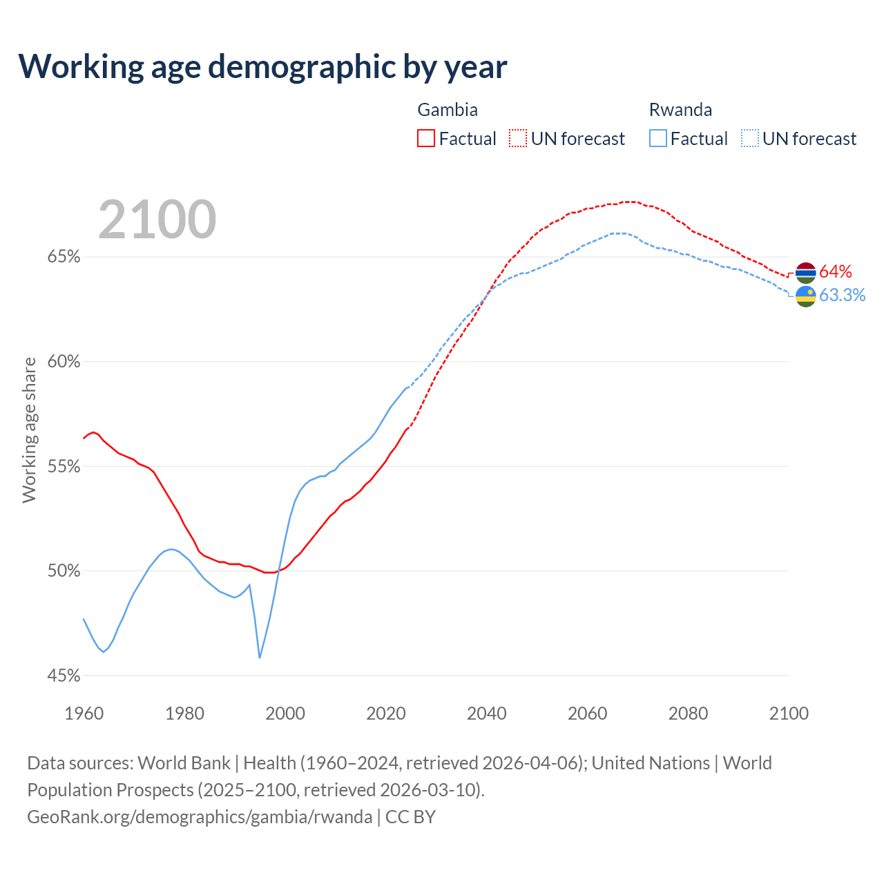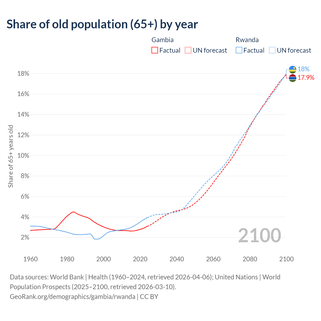The share of older people aged 65 and over is 3.08% in the Gambia and 3.93% in Rwanda. Life expectancy in the Gambia compared to Rwanda .