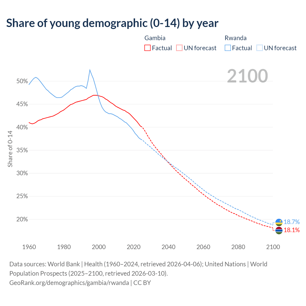- The share of young demographic (0-15 years old) in the Gambia is 40.2% vs 37.4% in Rwanda.