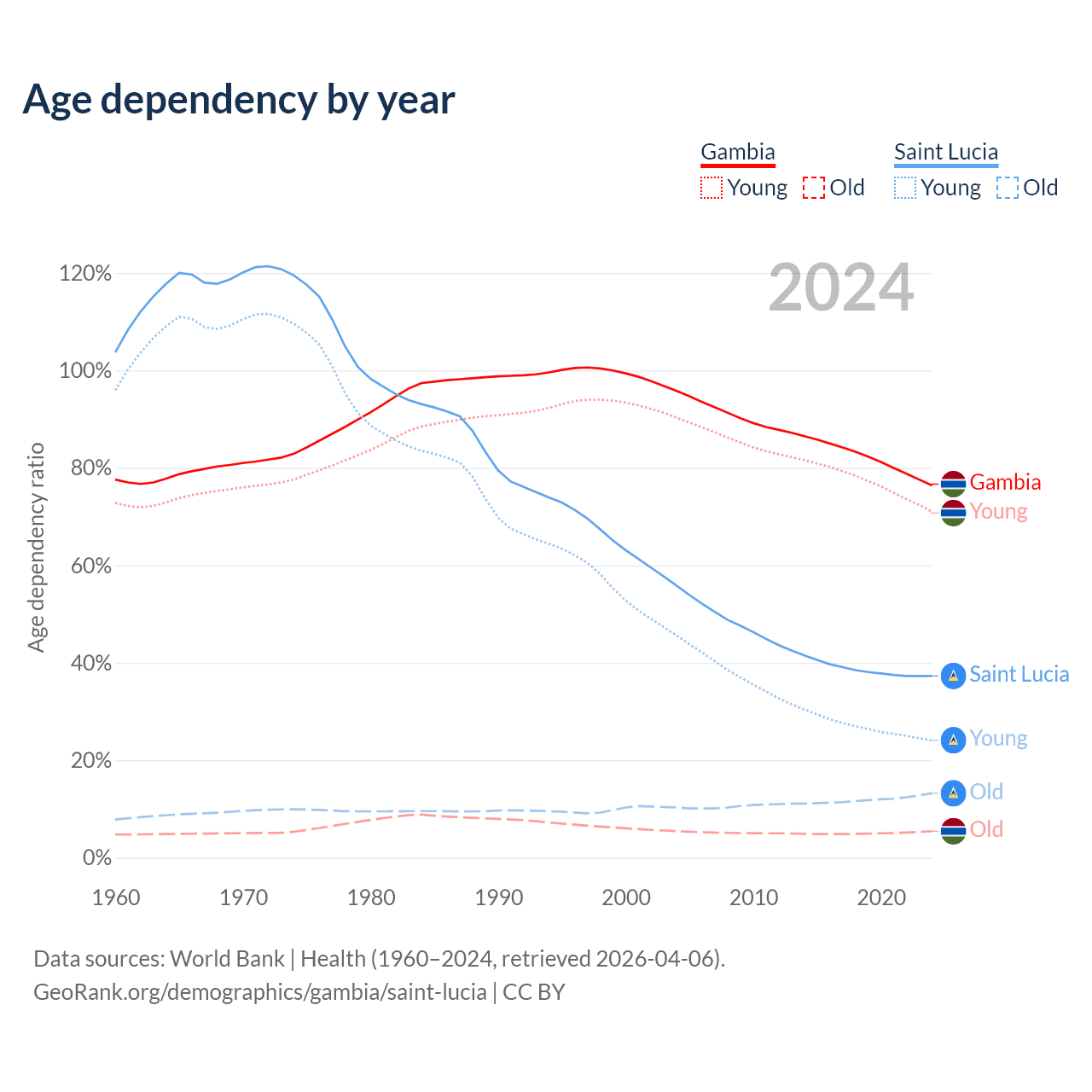 - The Gambia is ranked 171/196 by median age (oldest to youngest) vs 74/196 for Saint Lucia.