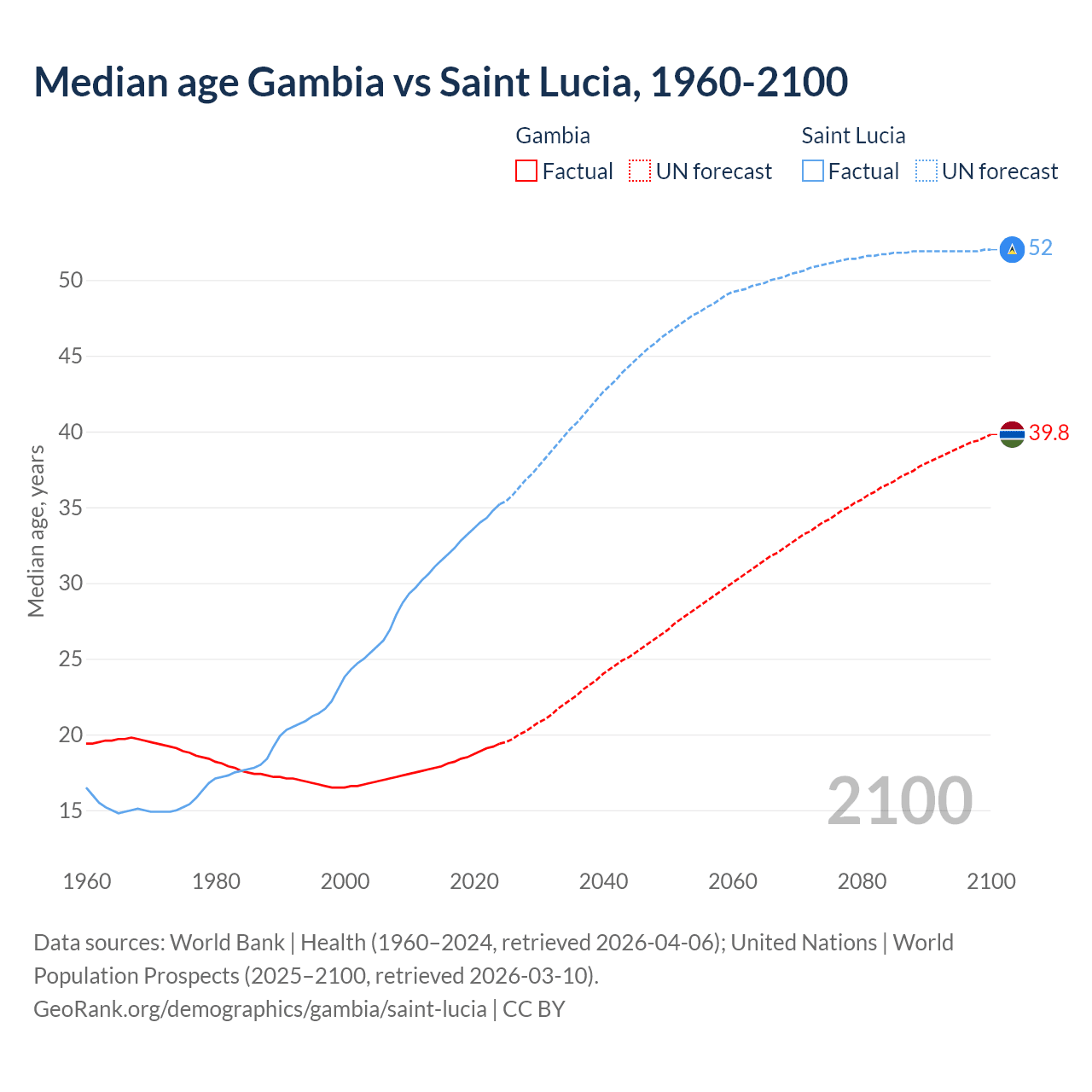 Median age Gambia vs Saint Lucia, 1960-2100