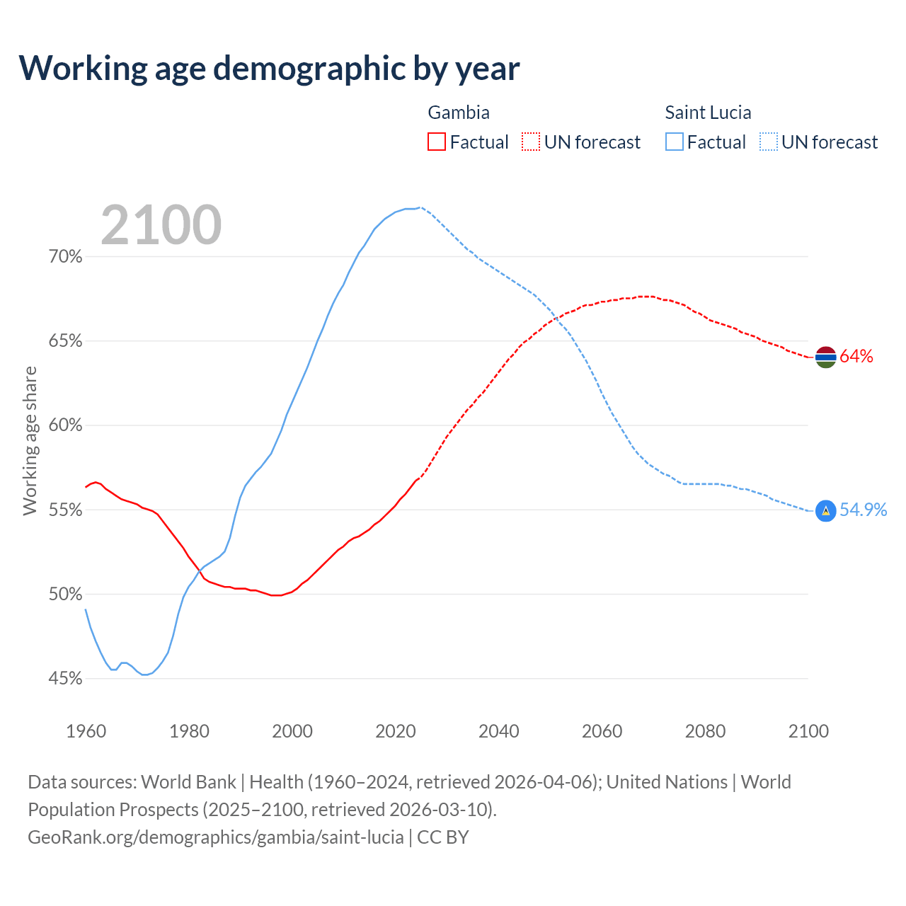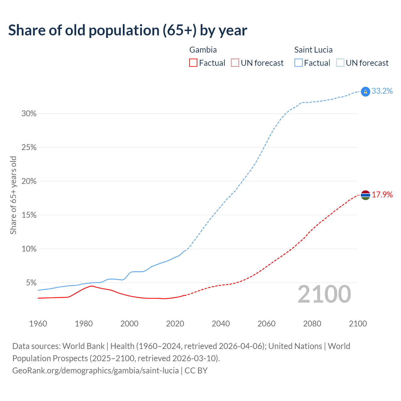 The share of older people aged 65 and over is 3.08% in the Gambia and 9.62% in Saint Lucia. Life expectancy in the Gambia compared to Saint Lucia .