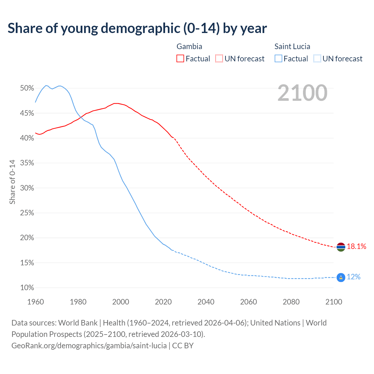 - The share of young demographic (0-15 years old) in the Gambia is 40.2% vs 17.5% in Saint Lucia.