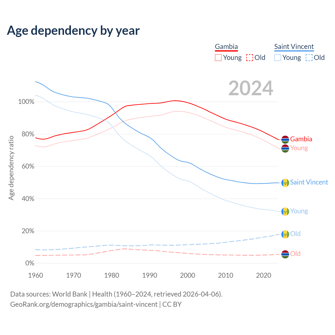 - The share of old-age demographic (65+) in the Gambia is 3.08% vs 11.9% in Saint Vincent.