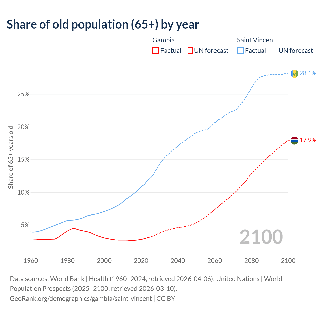 The share of older people aged 65 and over is 3.08% in the Gambia and 11.9% in Saint Vincent. Life expectancy in the Gambia compared to Saint Vincent .
