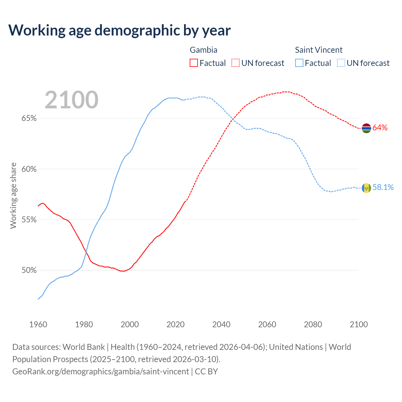 - The Gambia has 1.64M working age adults (aged 15-64) vs 66.3K in Saint Vincent.