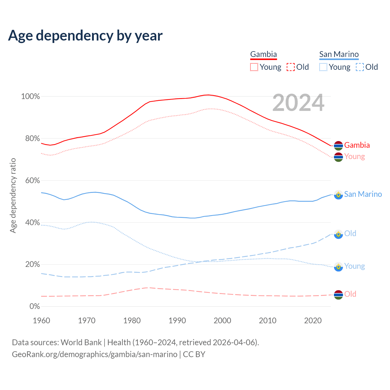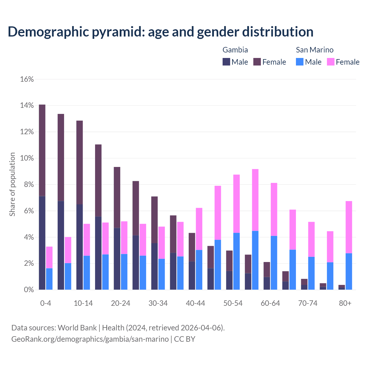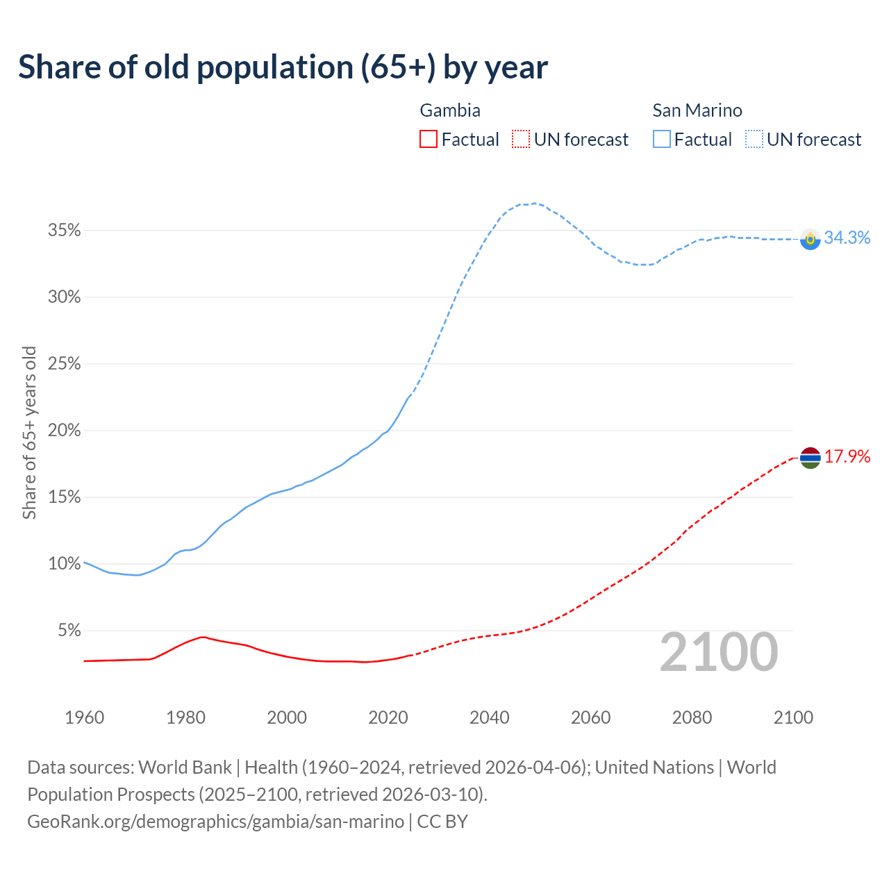 - The share of old-age demographic (65+) in the Gambia is 3.08% vs 22.4% in San Marino.
