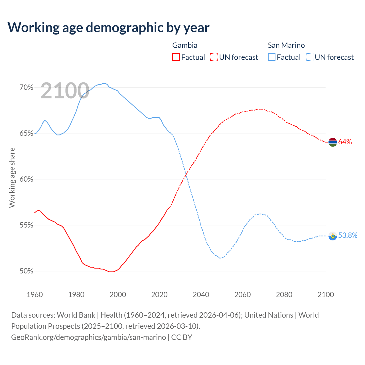 - The Gambia has 1.64M working age adults (aged 15-64) vs 22.2K in San Marino.