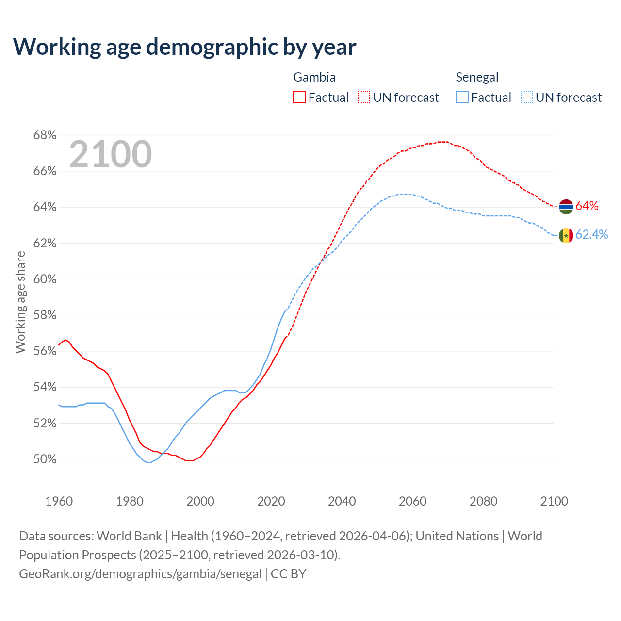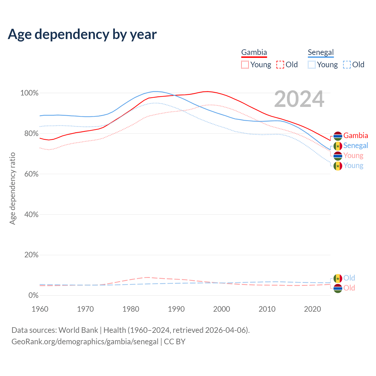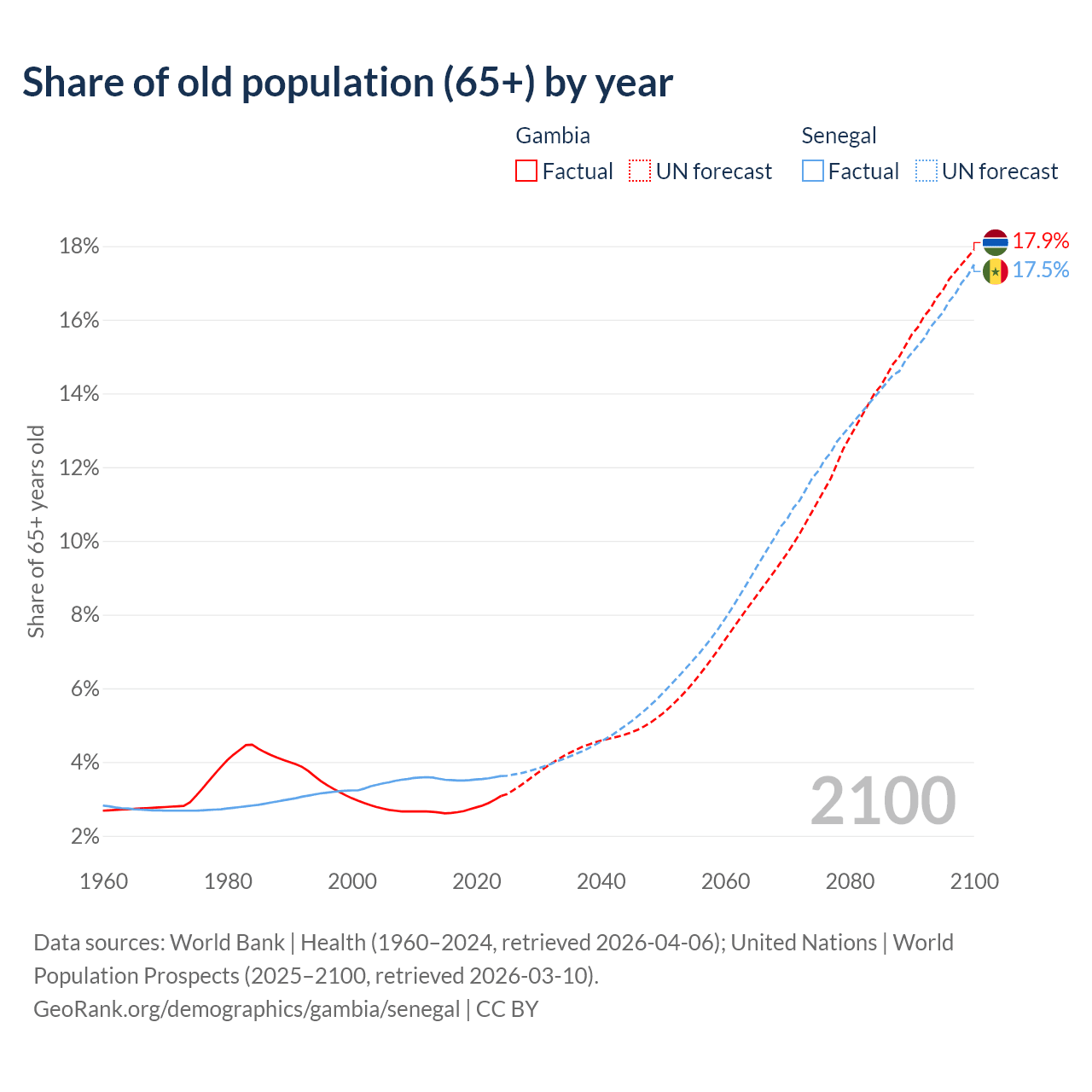 The share of older people aged 65 and over is 3.08% in the Gambia and 3.62% in Senegal. Life expectancy in the Gambia compared to Senegal .