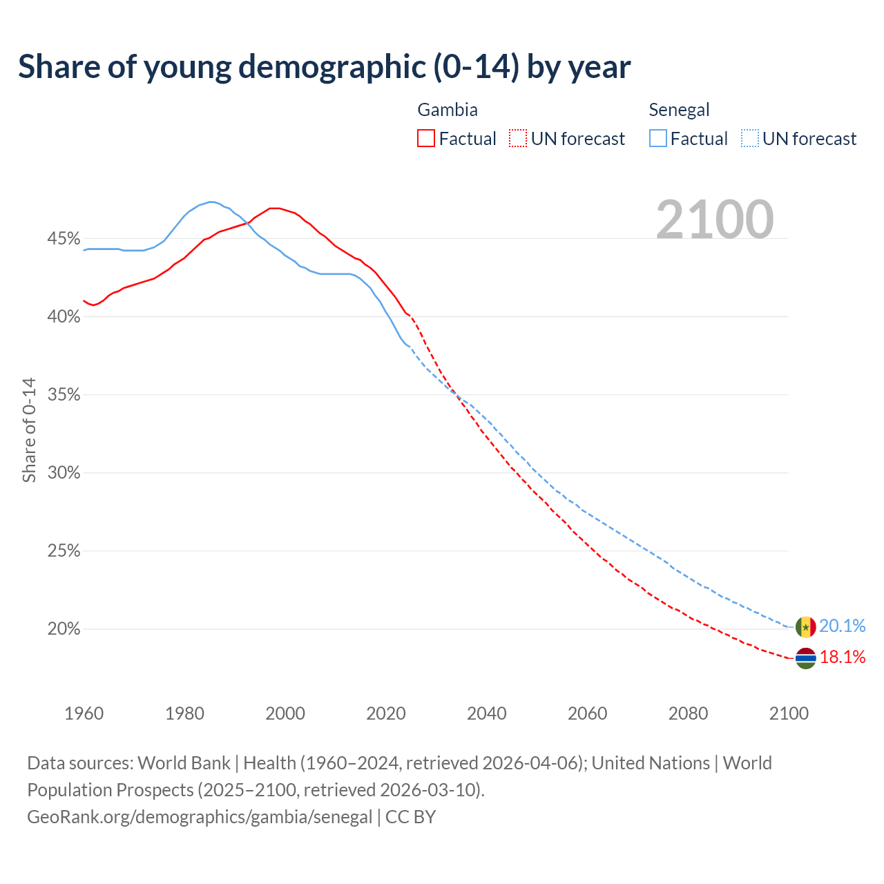 - The share of young demographic (0-15 years old) in the Gambia is 40.2% vs 38.2% in Senegal.