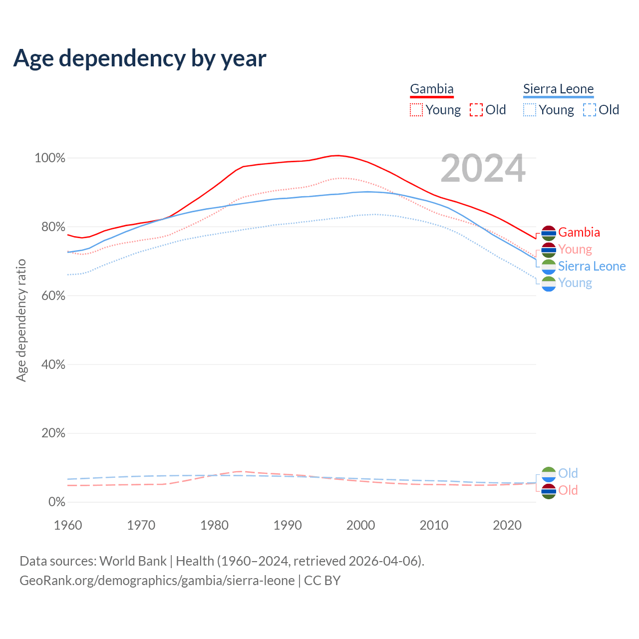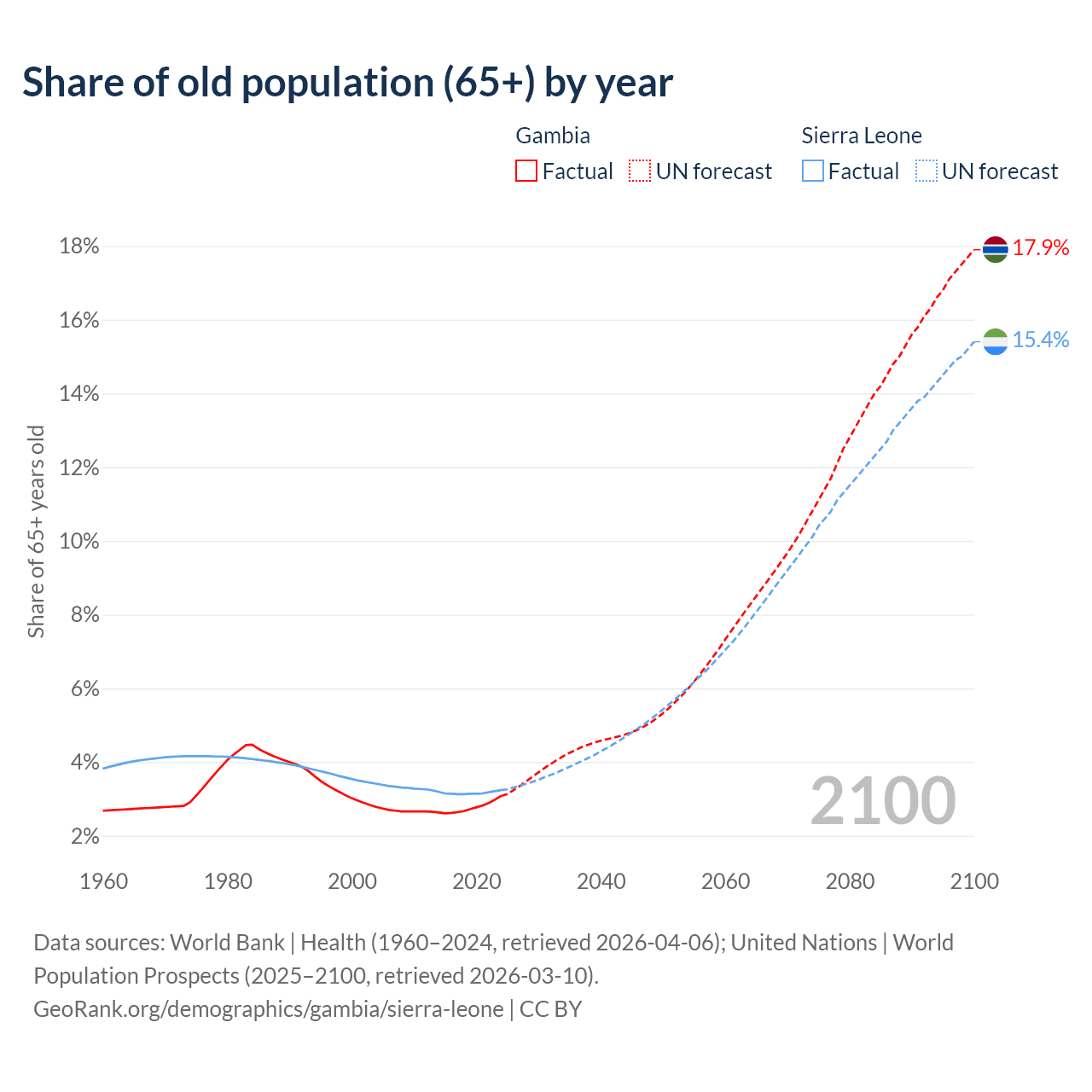 - The share of old-age demographic (65+) in the Gambia is 3.08% vs 3.24% in Sierra Leone.