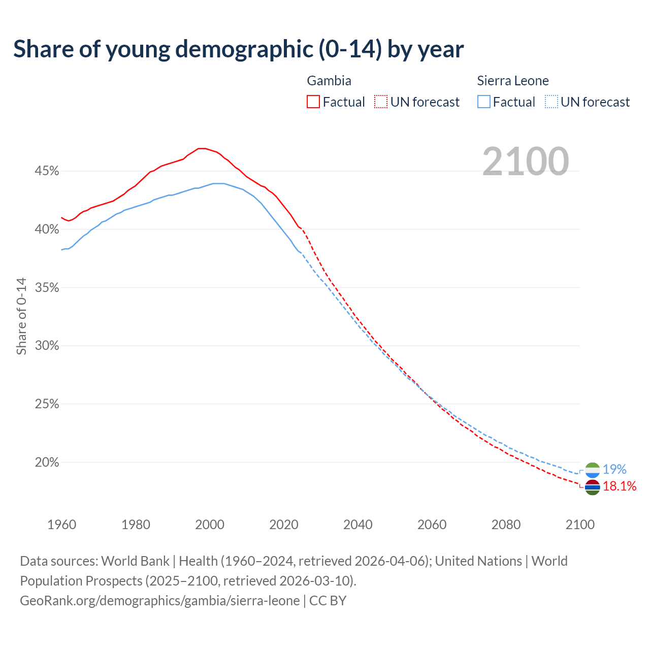 - The share of young demographic (0-15 years old) in the Gambia is 40.2% vs 38.1% in Sierra Leone.