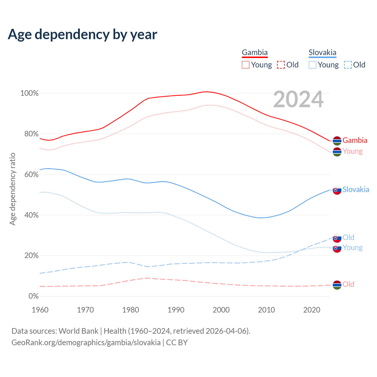 The share of older people aged 65 and over is 3.08% in the Gambia and 18.5% in Slovakia. Life expectancy in the Gambia compared to Slovakia .