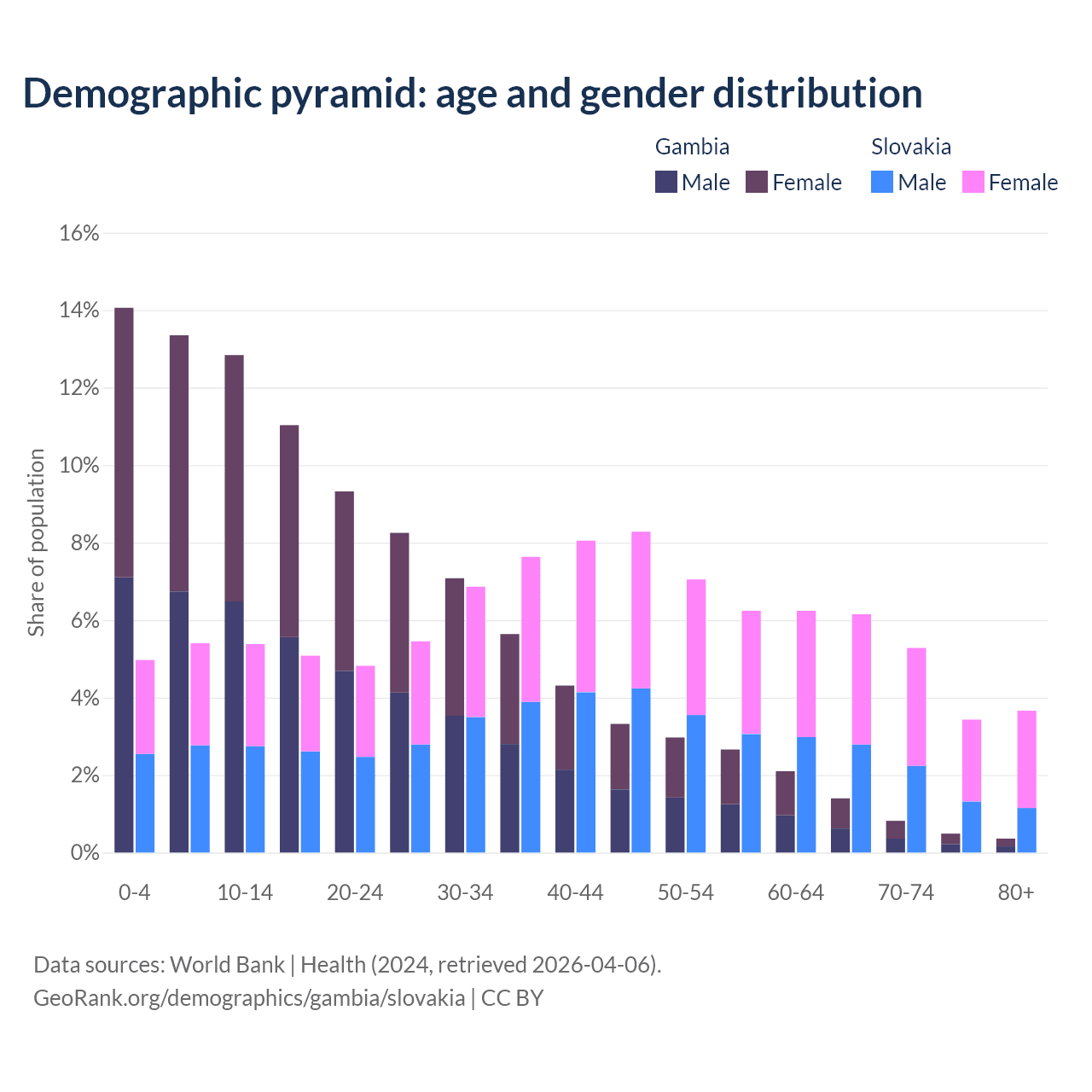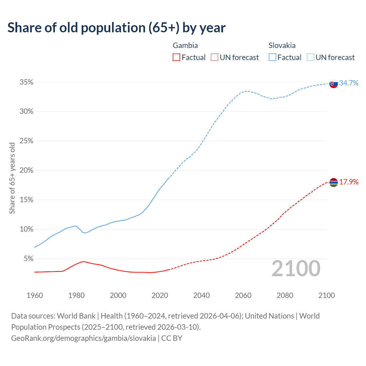 - The share of old-age demographic (65+) in the Gambia is 3.08% vs 18.5% in Slovakia.