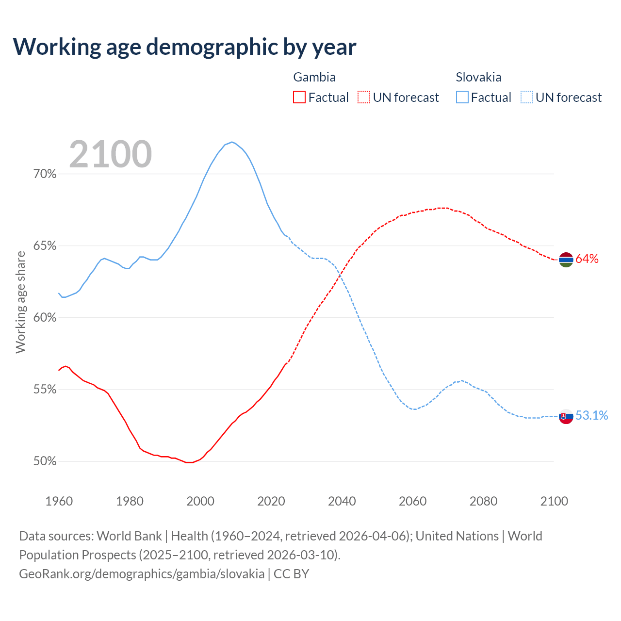 - The Gambia has 1.64M working age adults (aged 15-64) vs 3.52M in Slovakia.