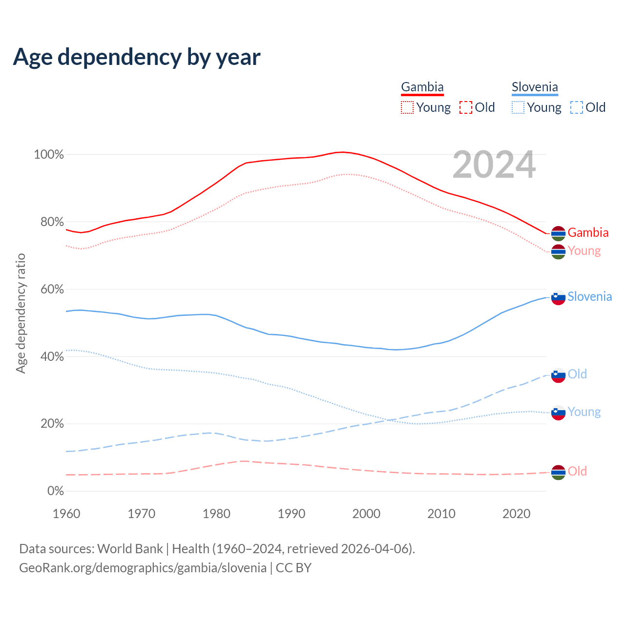 - The share of old-age demographic (65+) in the Gambia is 3.08% vs 21.8% in Slovenia.