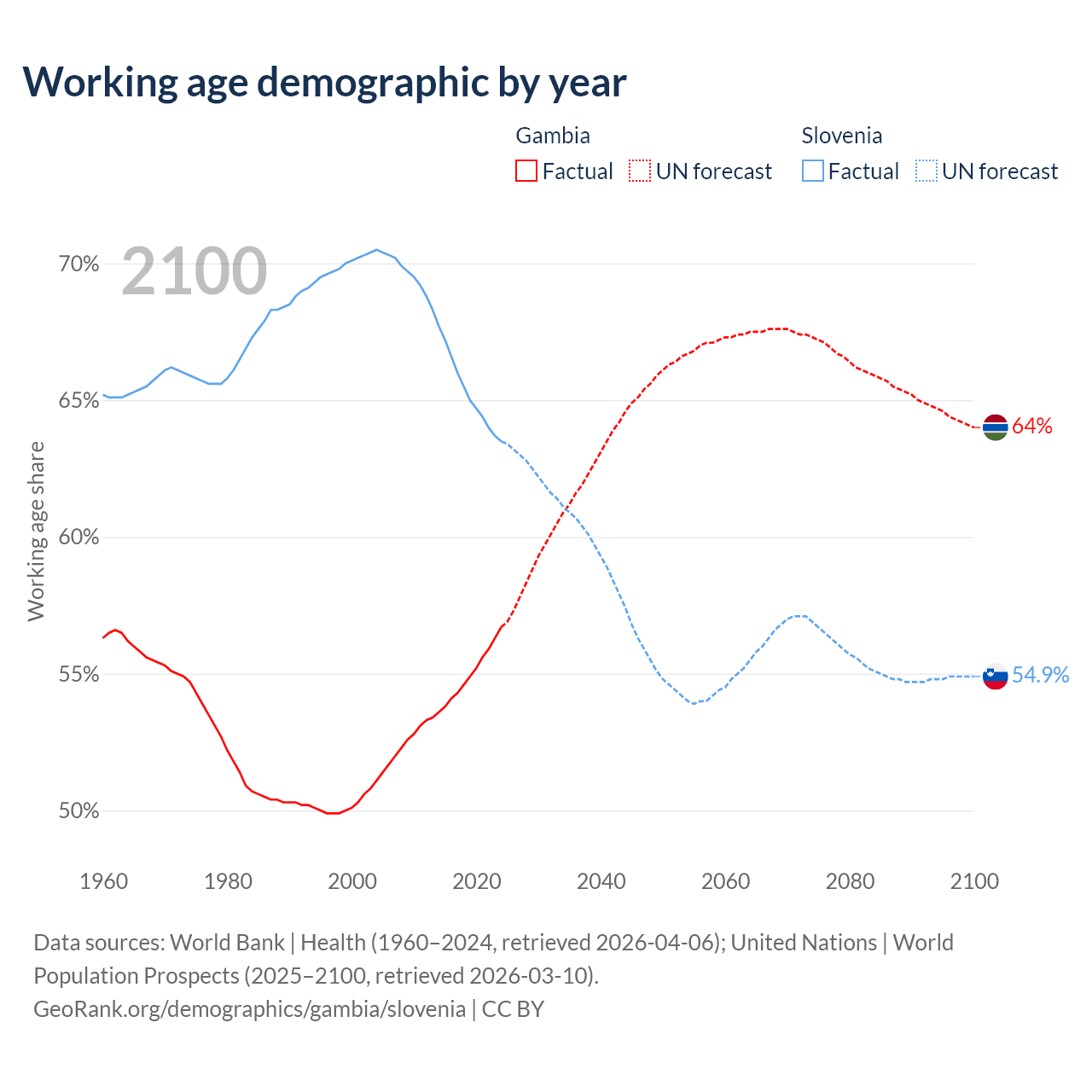 Median age Gambia vs Slovenia, 1960-2100
