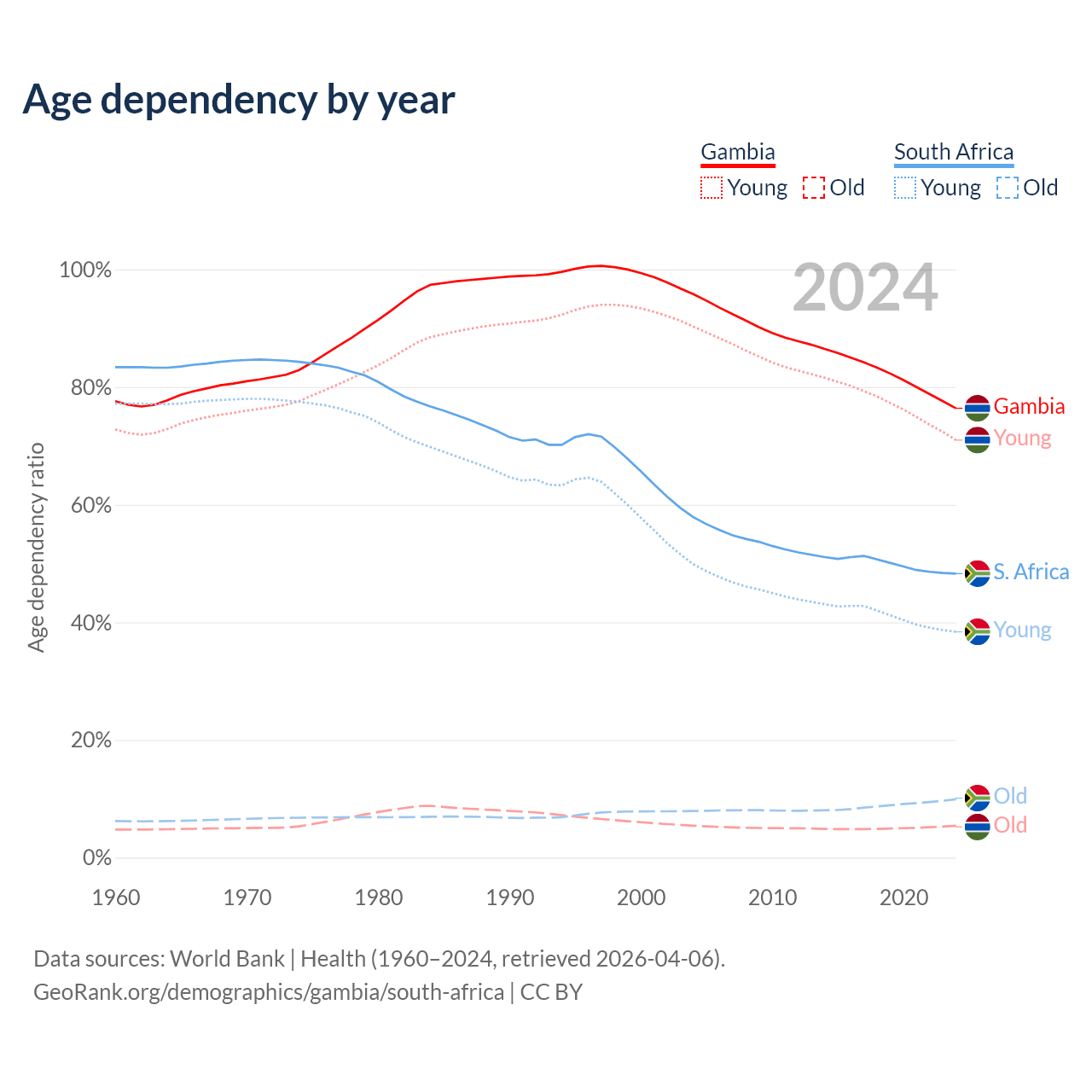 - The Gambia is ranked 171/196 by median age (oldest to youngest) vs 107/196 for South Africa.