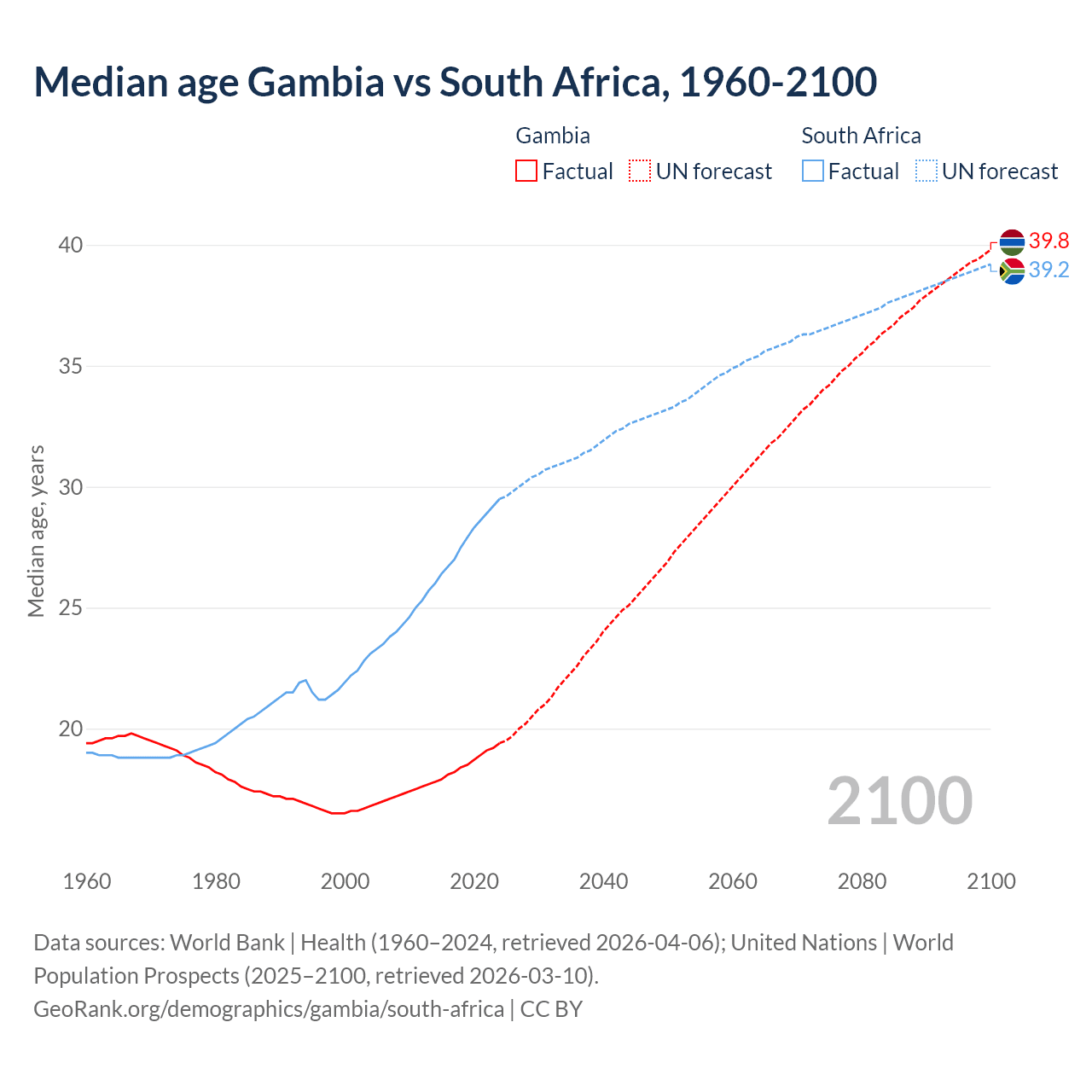 - The median age in the Gambia is 19.4 years compared to 29.5 years in South Africa.