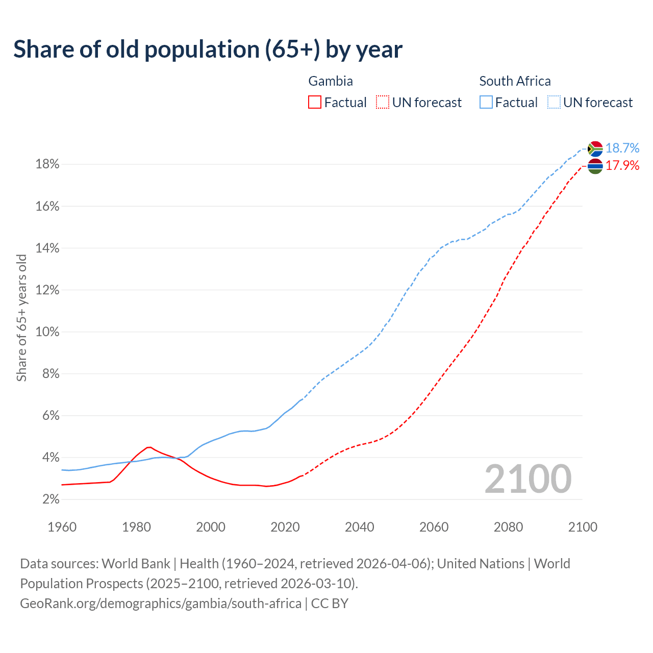 The share of older people aged 65 and over is 3.08% in the Gambia and 6.69% in South Africa. Life expectancy in the Gambia compared to South Africa .
