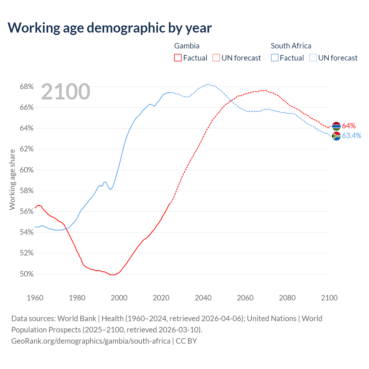 - The Gambia has 1.64M working age adults (aged 15-64) vs 44.3M in South Africa.