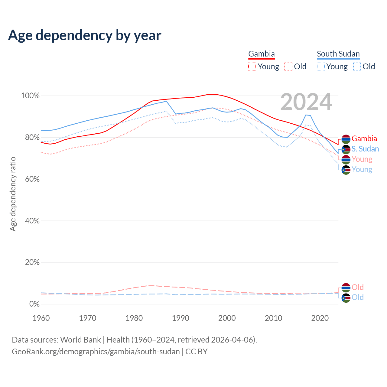 - The share of old-age demographic (65+) in the Gambia is 3.08% vs 2.99% in South Sudan.