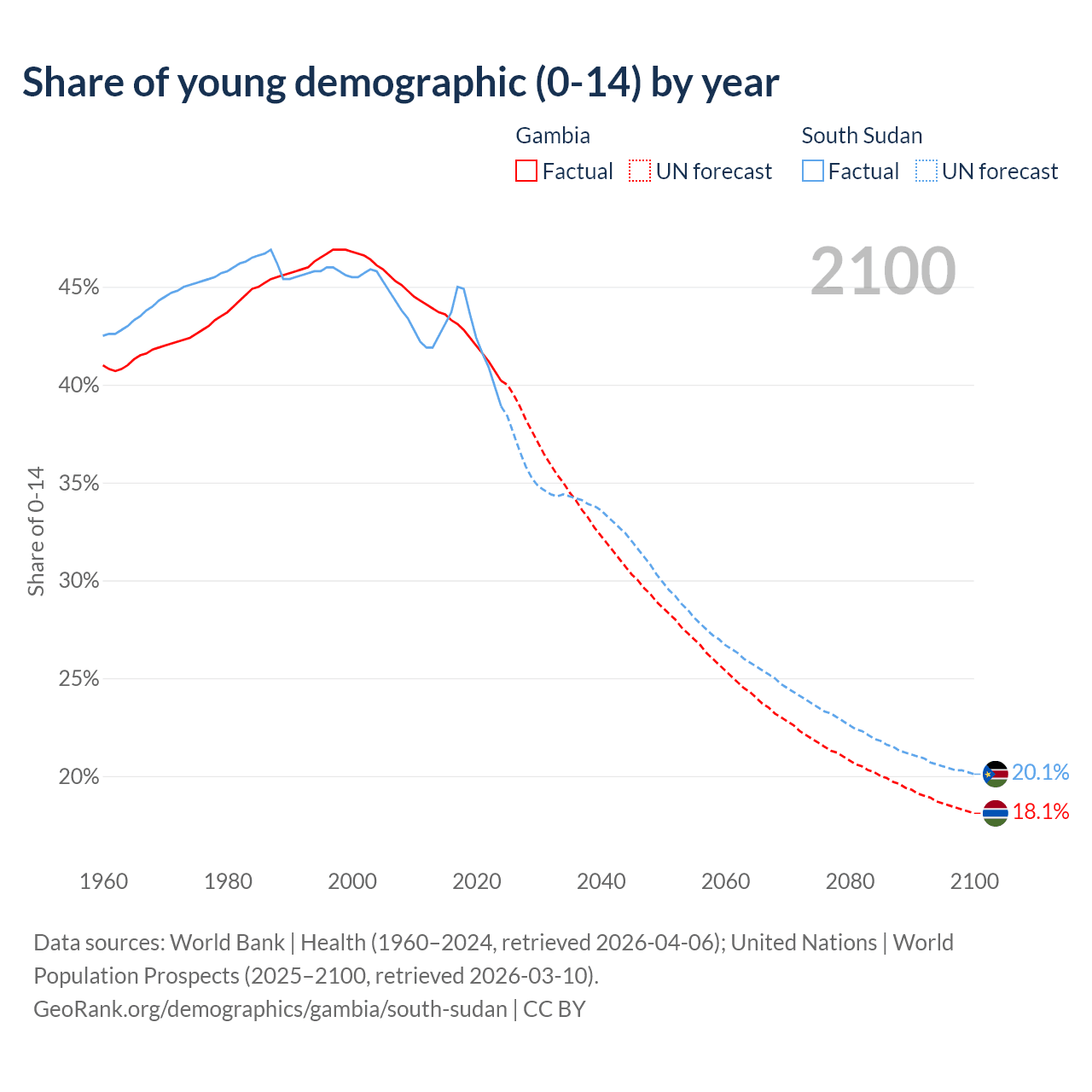 - The share of young demographic (0-15 years old) in the Gambia is 40.2% vs 38.9% in South Sudan.