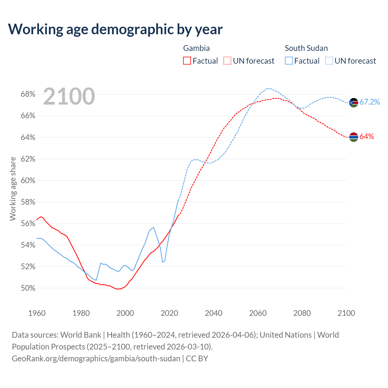 Median age Gambia vs South Sudan, 1960-2100