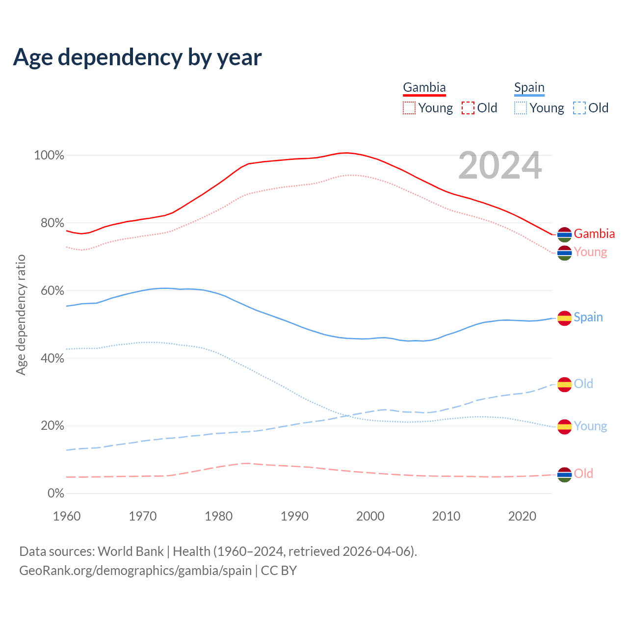 - The Gambia is ranked 171/196 by median age (oldest to youngest) vs 7/196 for Spain.