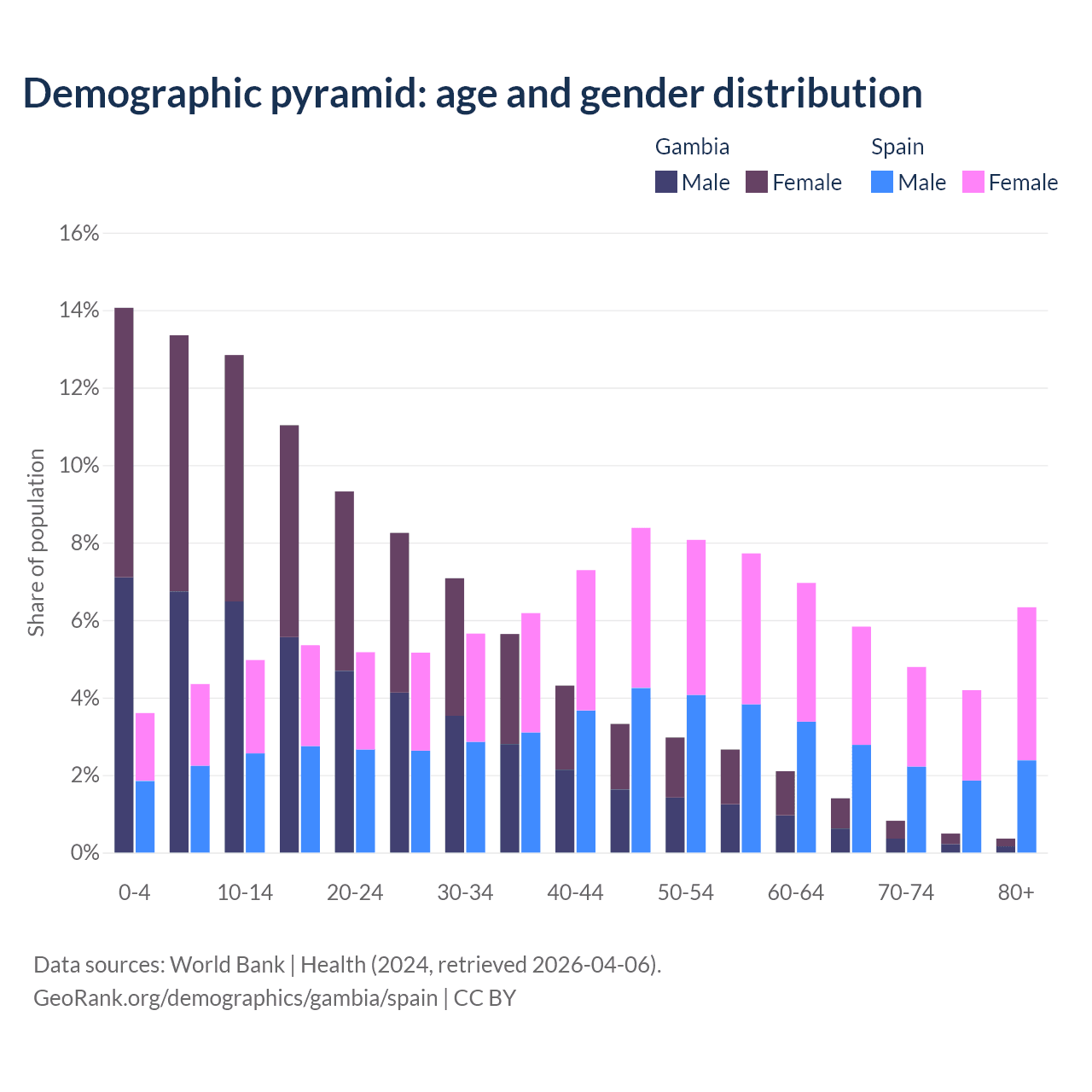 Demographics of the Gambia compared to Spain: