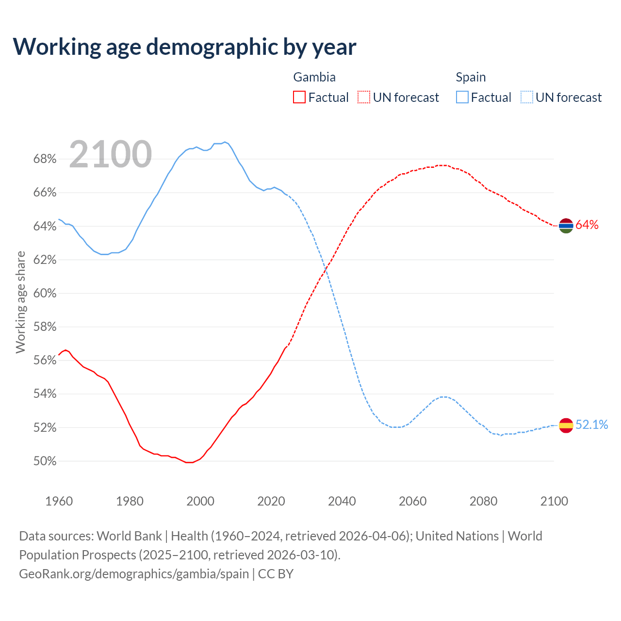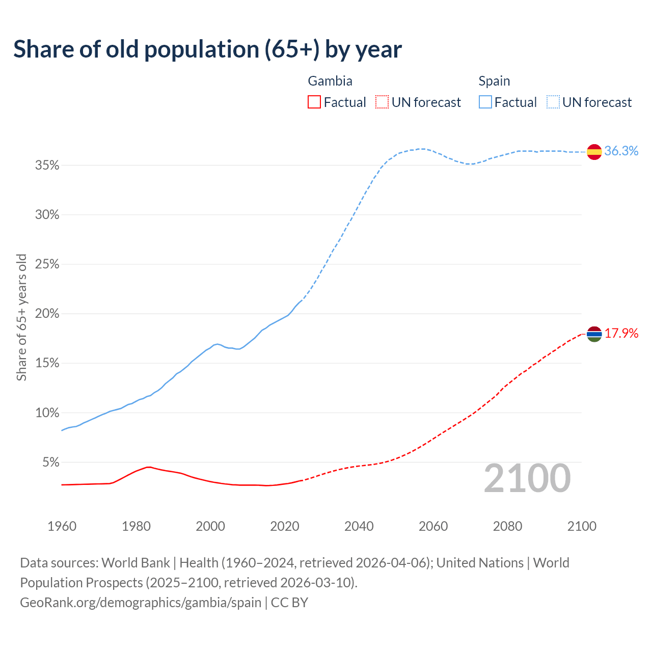 The share of older people aged 65 and over is 3.08% in the Gambia and 21.1% in Spain. Life expectancy in the Gambia compared to Spain .