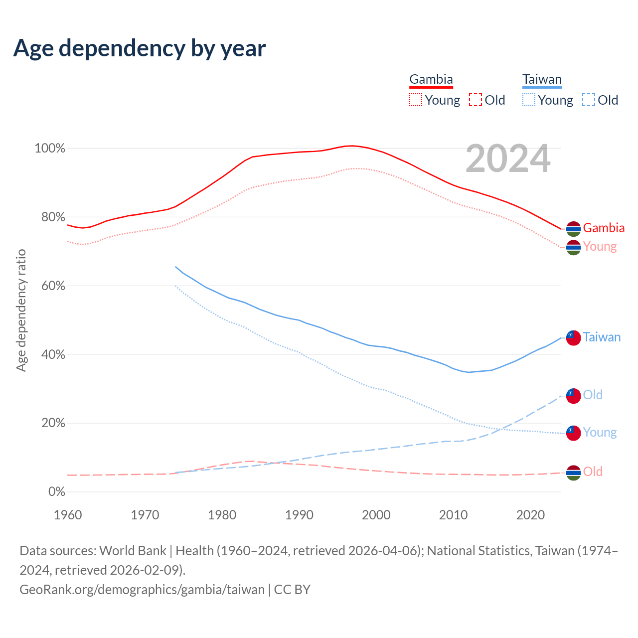 - The Gambia is ranked 171/196 by median age (oldest to youngest) vs 16/196 for Taiwan.