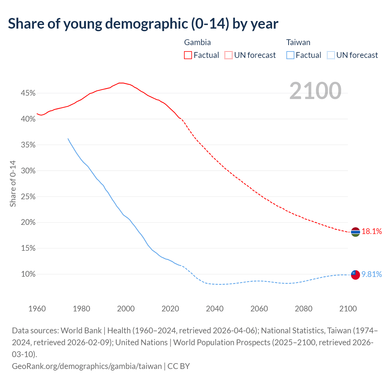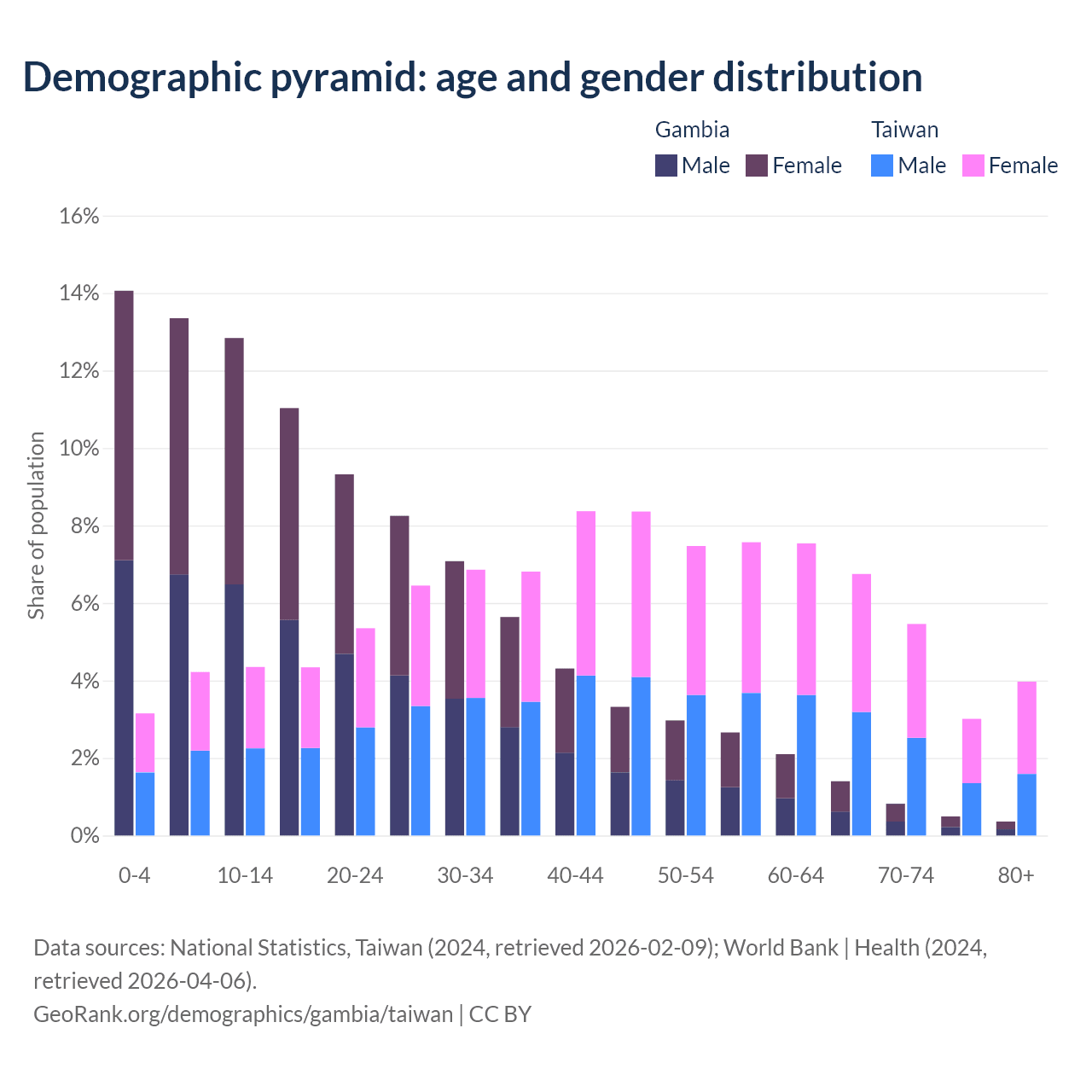 - The share of young demographic (0-15 years old) in the Gambia is 40.2% vs 11.7% in Taiwan.
