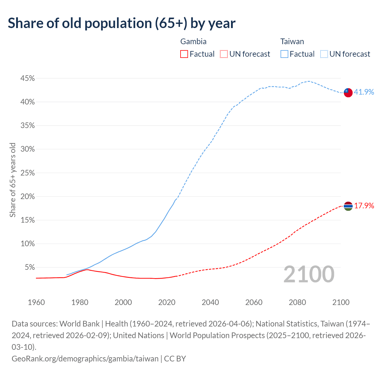 - The share of old-age demographic (65+) in the Gambia is 3.08% vs 19.2% in Taiwan.