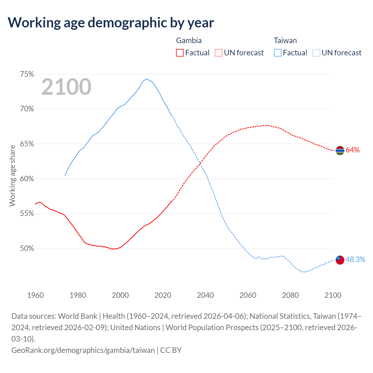 Median age Gambia vs Taiwan, 1960-2100