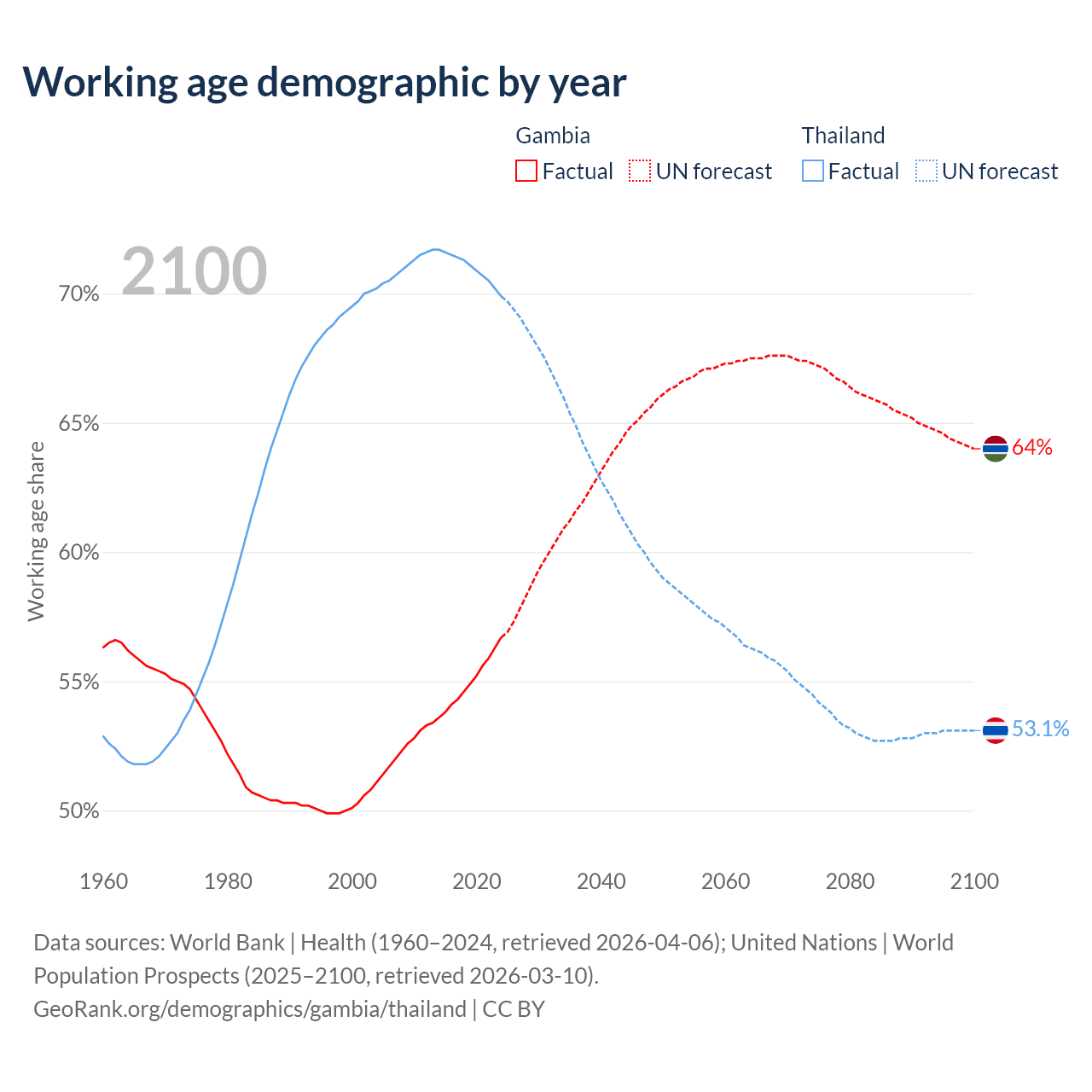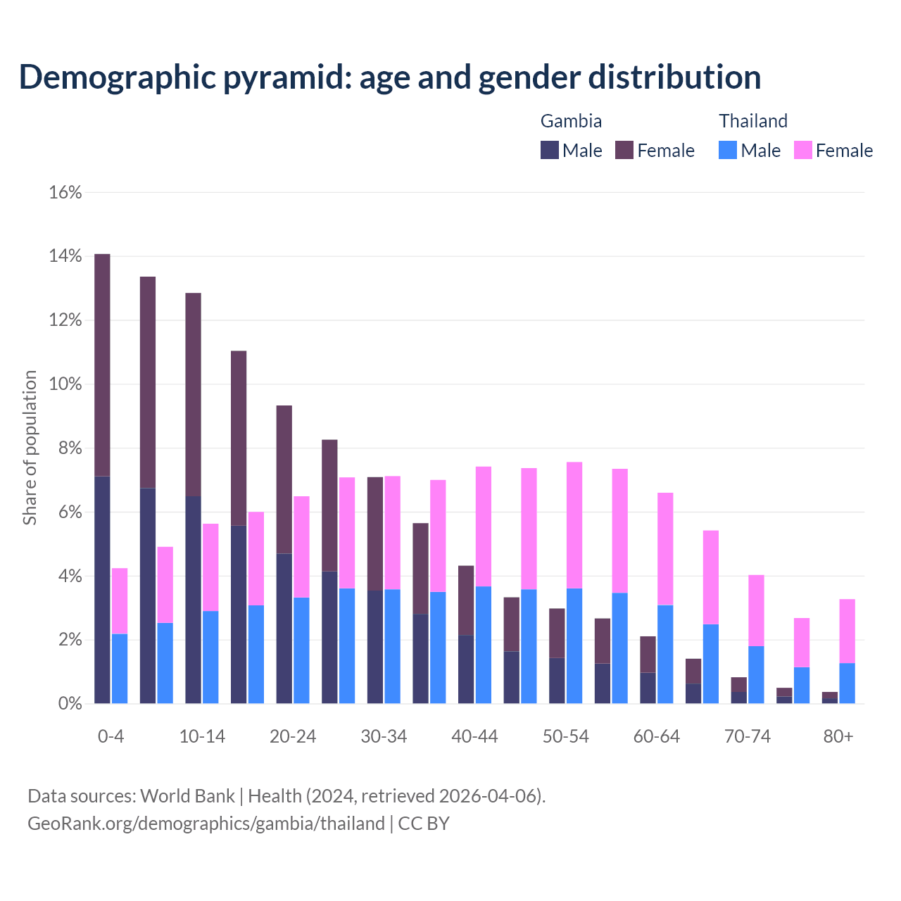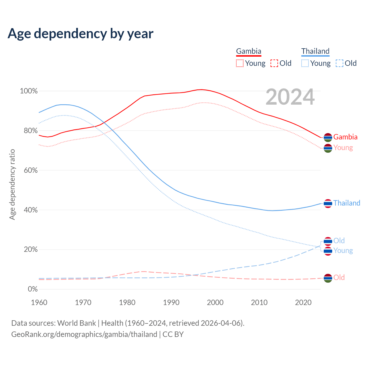 - The Gambia is ranked 171/196 by median age (oldest to youngest) vs 40/196 for Thailand.