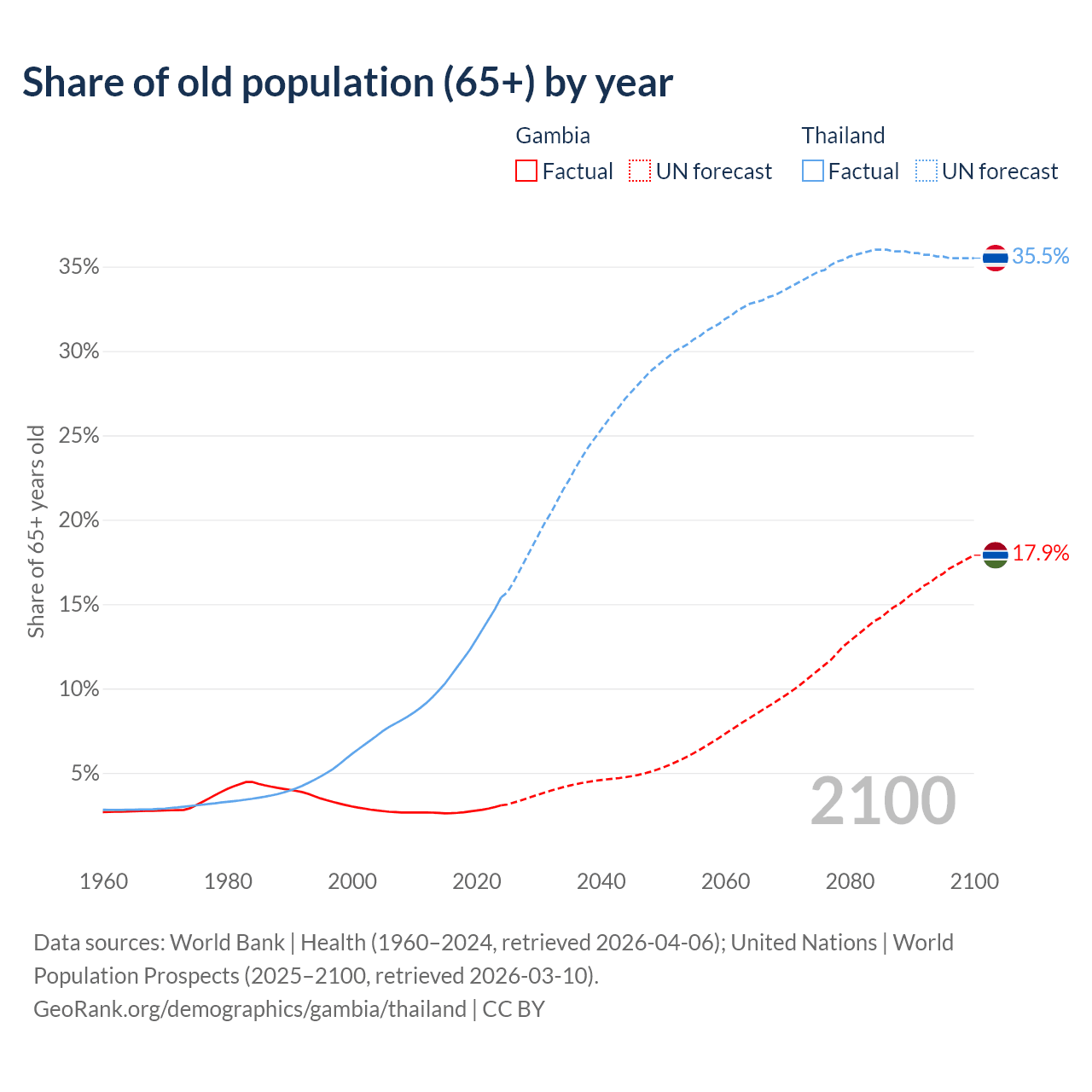 The share of older people aged 65 and over is 3.08% in the Gambia and 15.4% in Thailand. Life expectancy in the Gambia compared to Thailand .