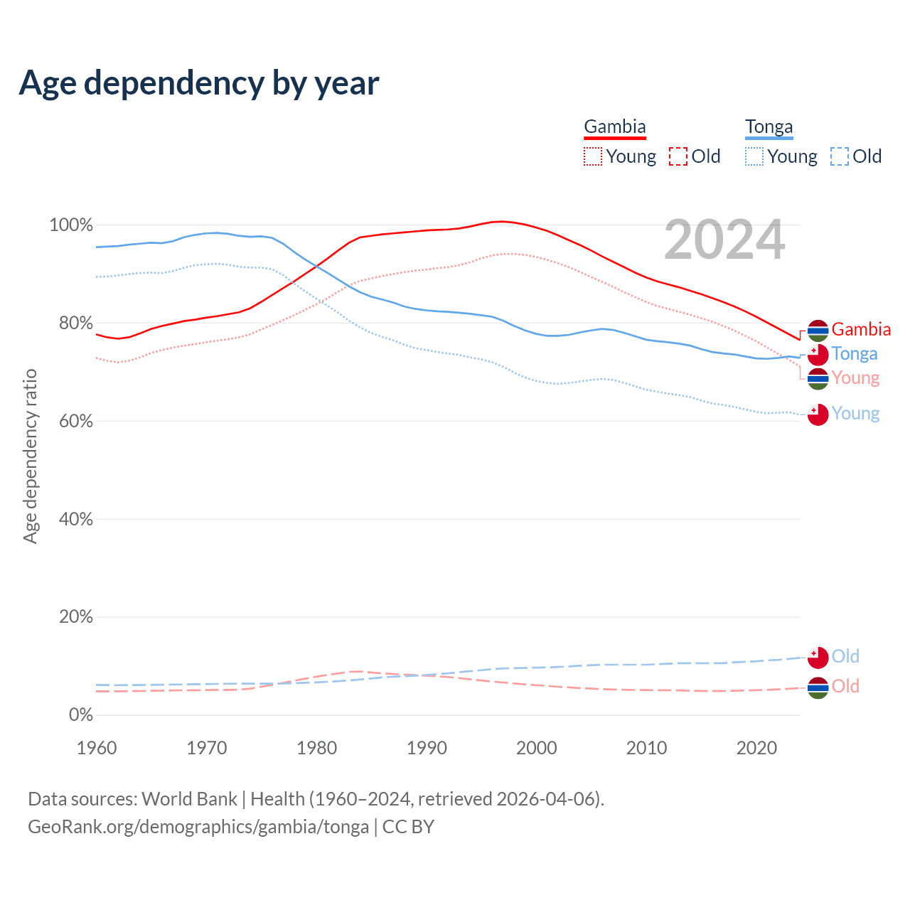- The Gambia is ranked 171/196 by median age (oldest to youngest) vs 149/196 for Tonga.