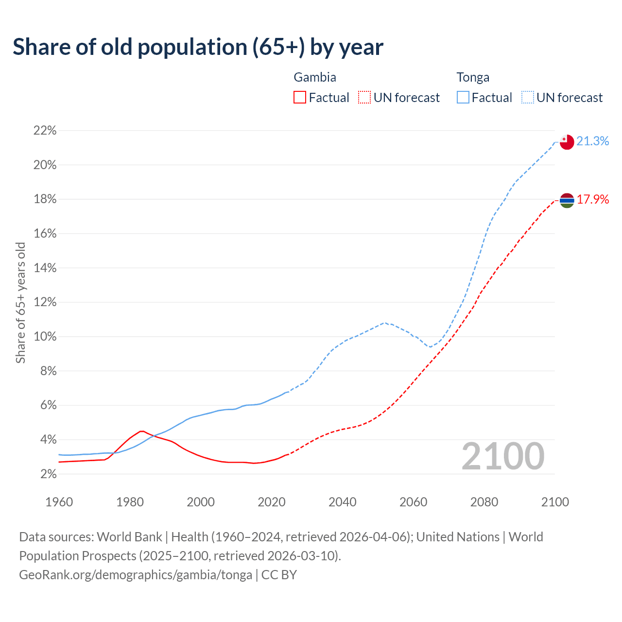 The share of older people aged 65 and over is 3.08% in the Gambia and 6.72% in Tonga. Life expectancy in the Gambia compared to Tonga .