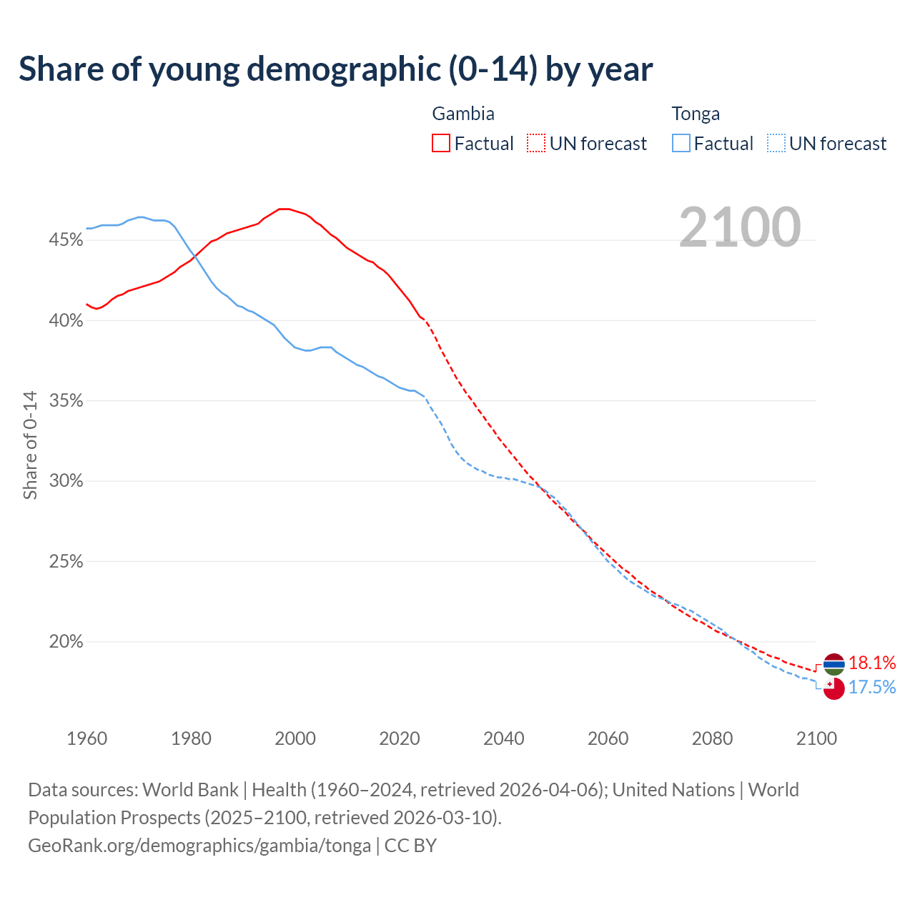 - The share of young demographic (0-15 years old) in the Gambia is 40.2% vs 35.4% in Tonga.